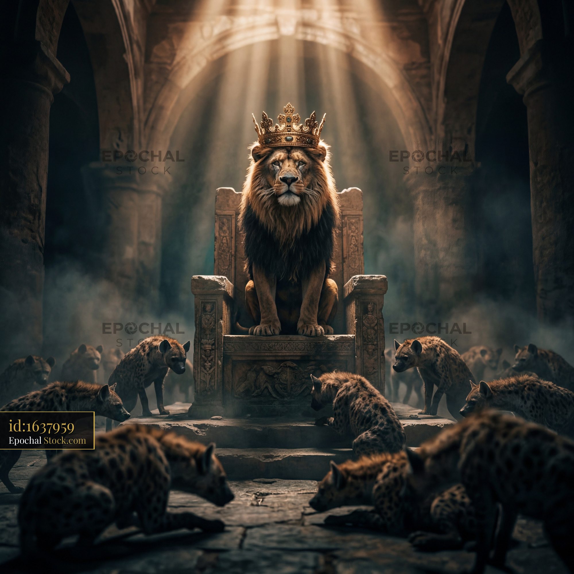Lion sits on throne while hyenas gather in shadowy ruins Premium Stock Image