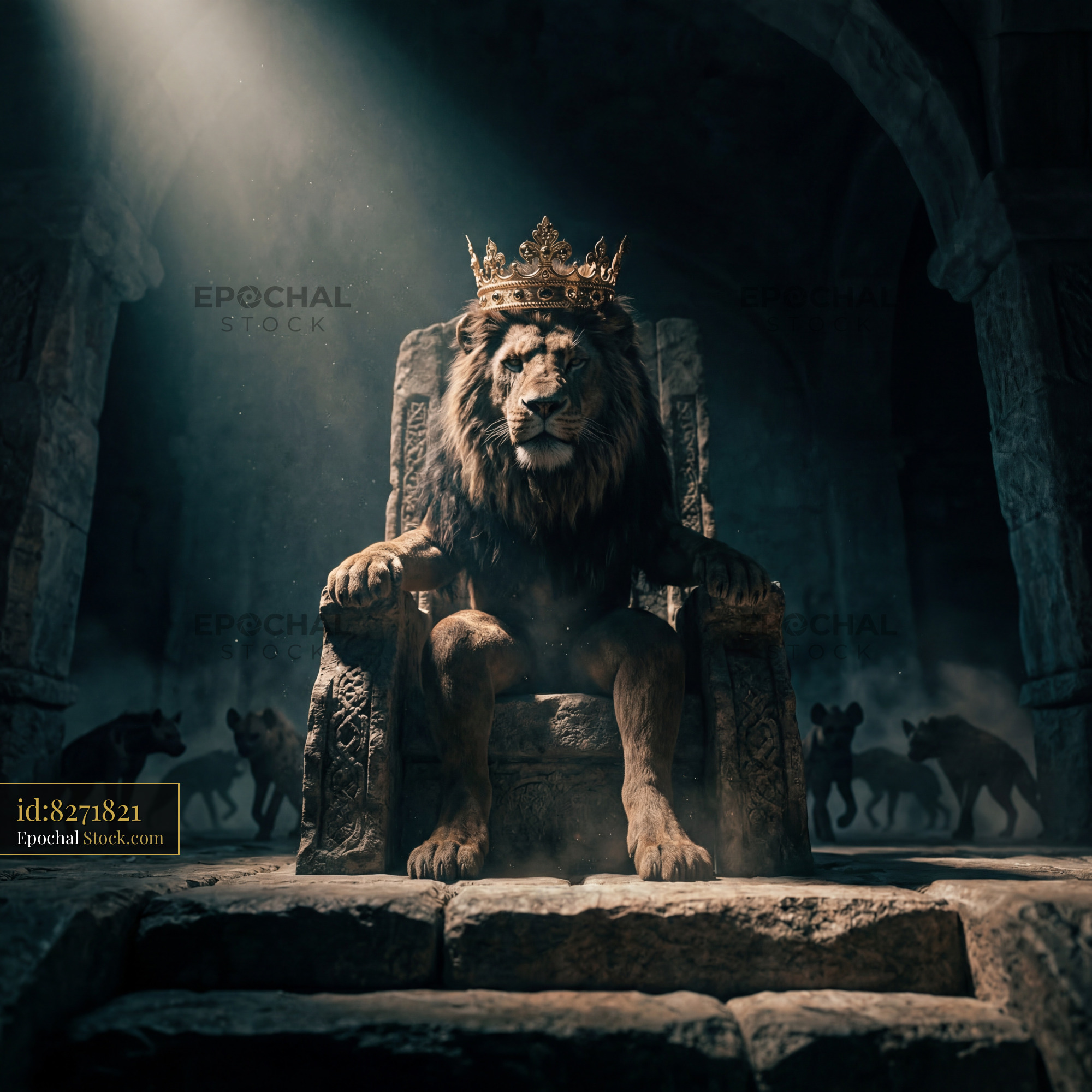 A lion wearing a crown sits on a throne in a dark stone room. Shadows of wolves can be seen in the background, creating a mysterious scene. Light shines down from above.