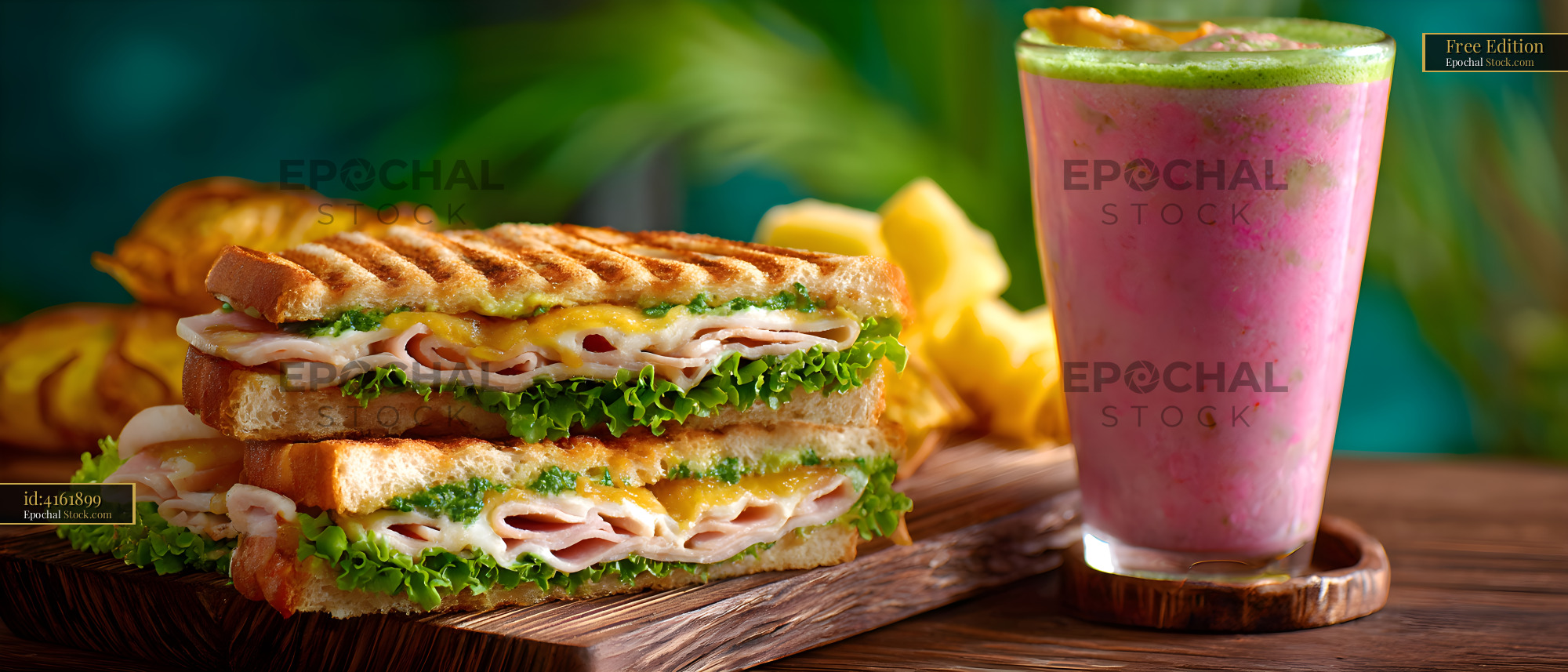 Lunch featuring sandwich and smoothie on wooden table Free Premium Stock Photo