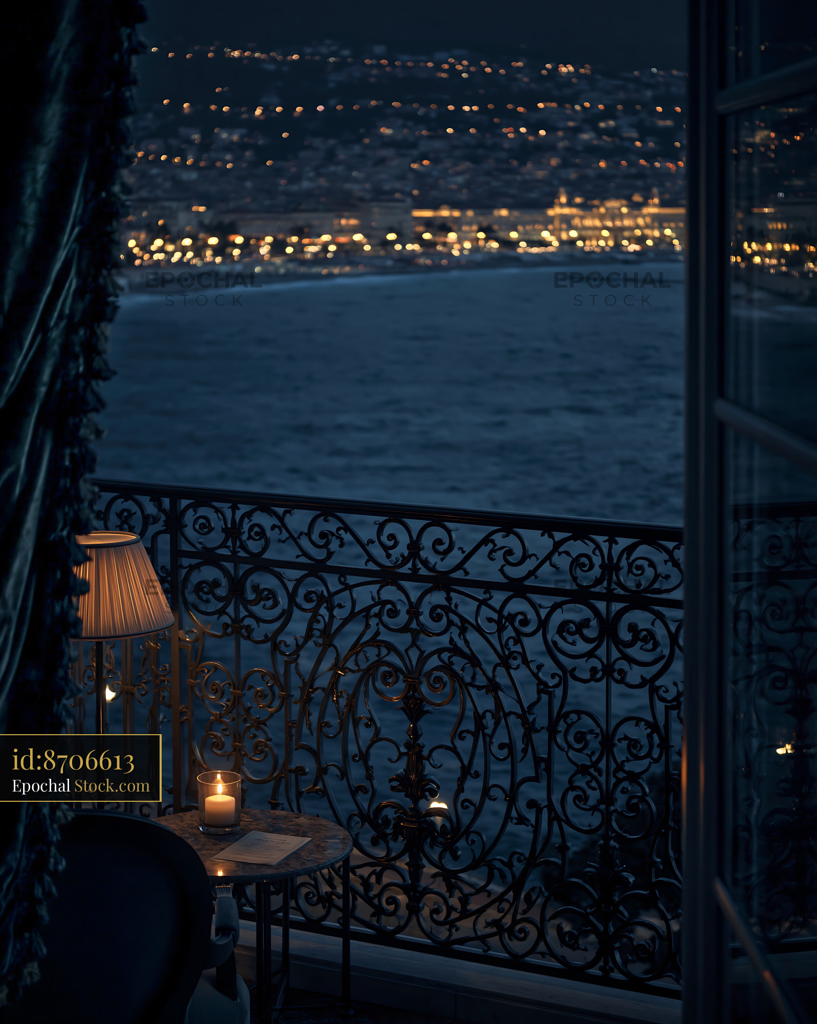 An ornate wrought iron balcony offers a romantic view of a shimmering coastal city and the dark ocean at night, featuring a candlelit table and warm ambient lighting.