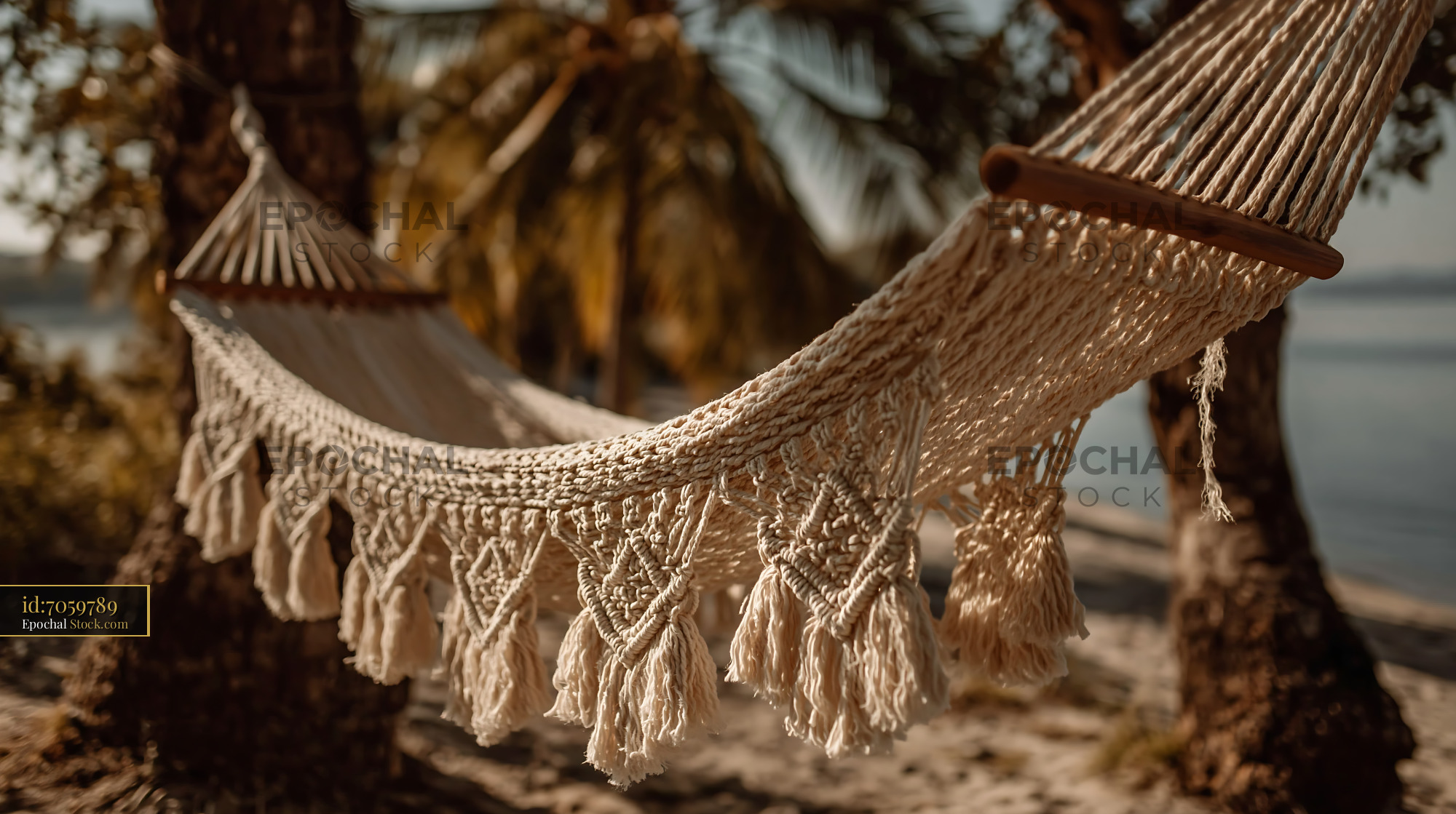 Macrame hammock between palm trees on a sunny tropical beach