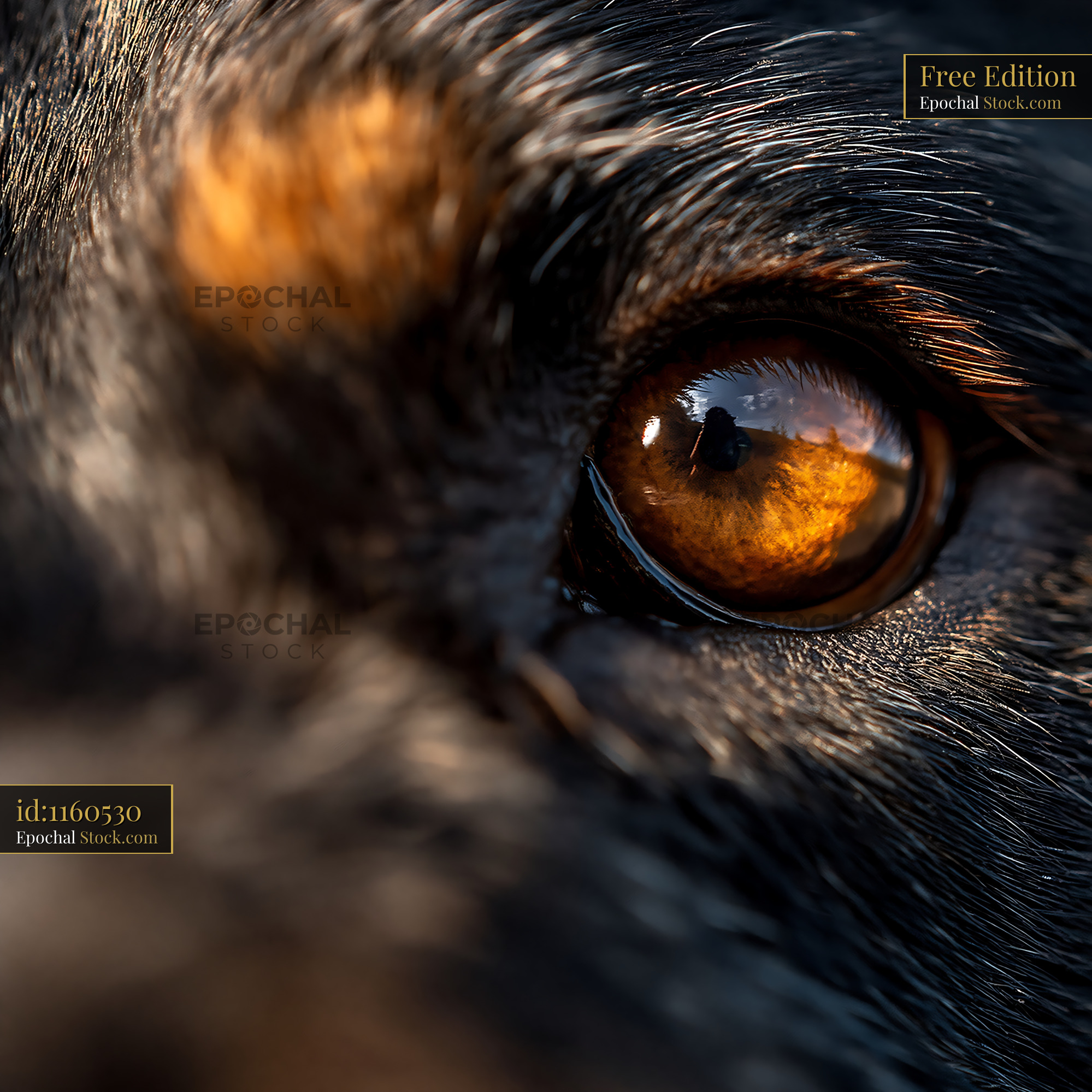 A detailed macro shot of a dog's amber eye reflecting a vast landscape at sunset, evoking themes of loyalty, animal soulfulness, and a deep bond with nature.