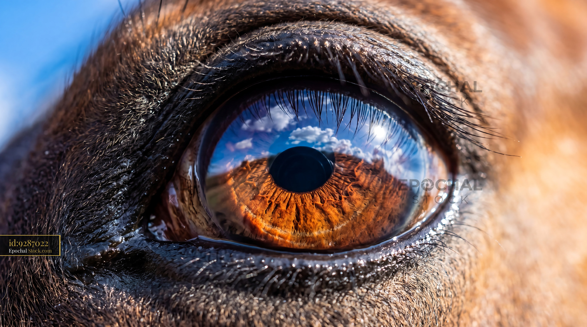 This striking macro horse eye pattern features a glossy reflection of the sky. Perfect for unique equestrian home decor, statement wallpaper, or custom quilting fabric projects.