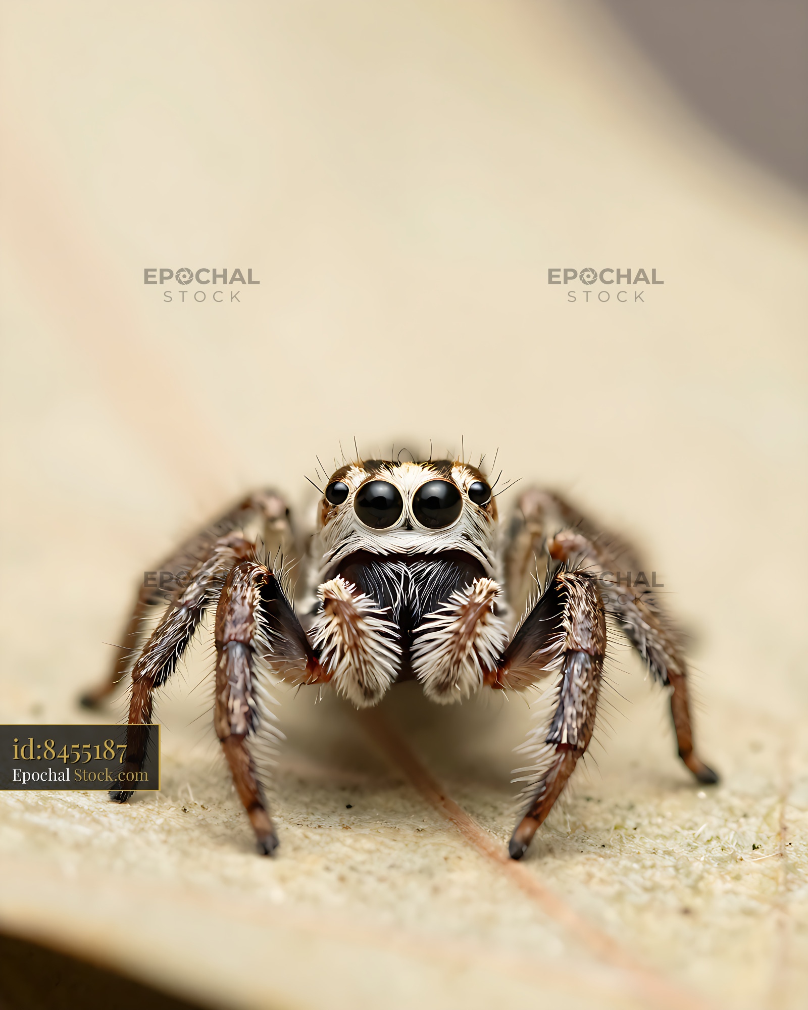 A detailed close-up of a small jumping spider with large, expressive eyes looking directly at the camera, highlighting the fascinating beauty and intricate textures of nature.