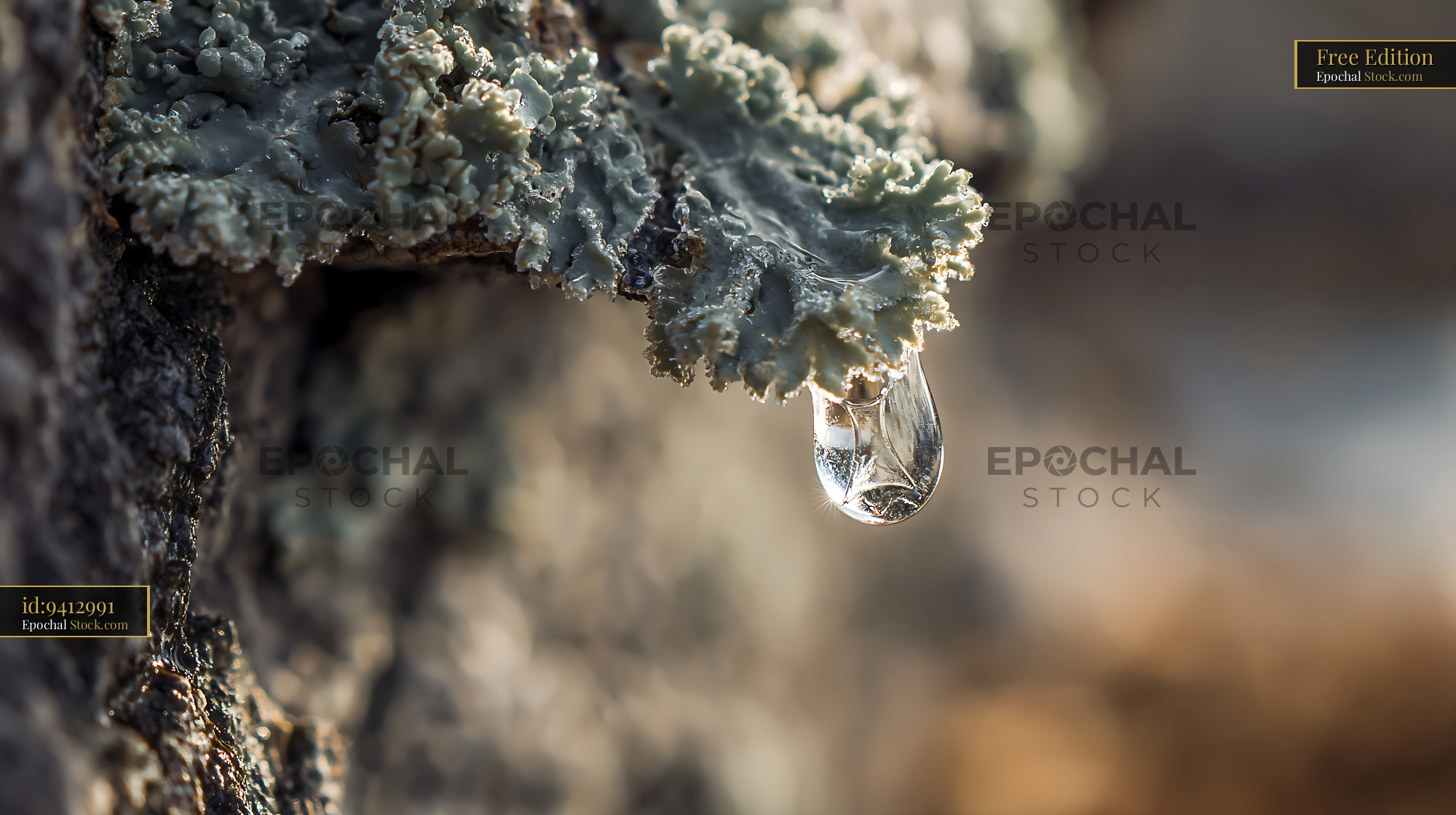 Macro shot of a frozen water drop hanging from lichen on a tree trunk