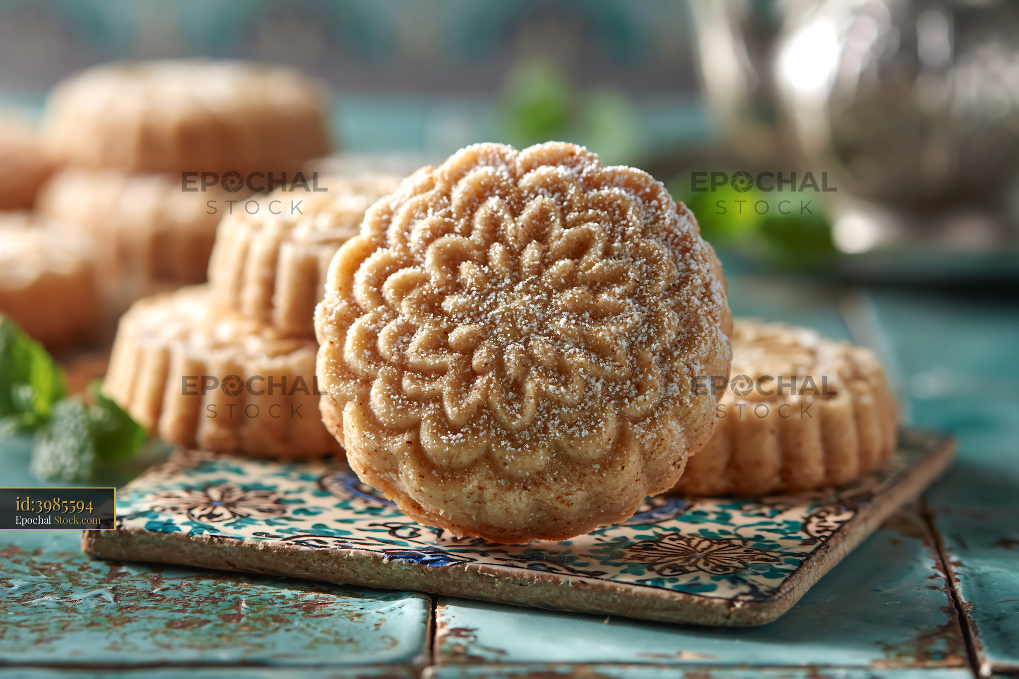 Traditional mahlab spice biscuits with intricate patterns and powdered sugar, served on decorative tiles, evoking Middle Eastern hospitality and festive celebration.