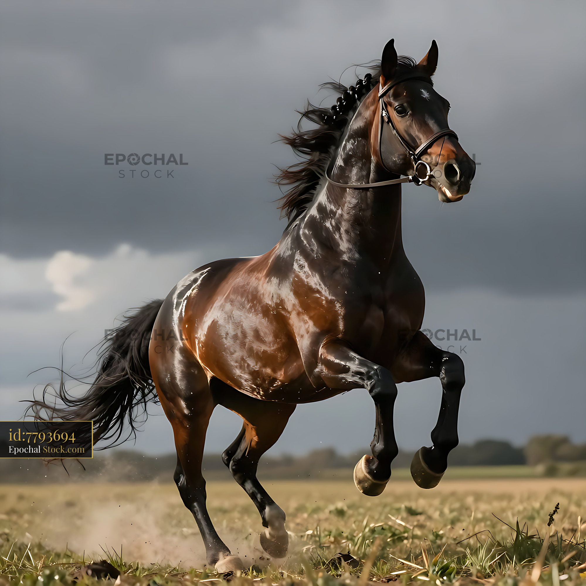 A powerful dark bay horse displays raw energy and grace while galloping across an open rural field, set against a dramatic backdrop of dark storm clouds.