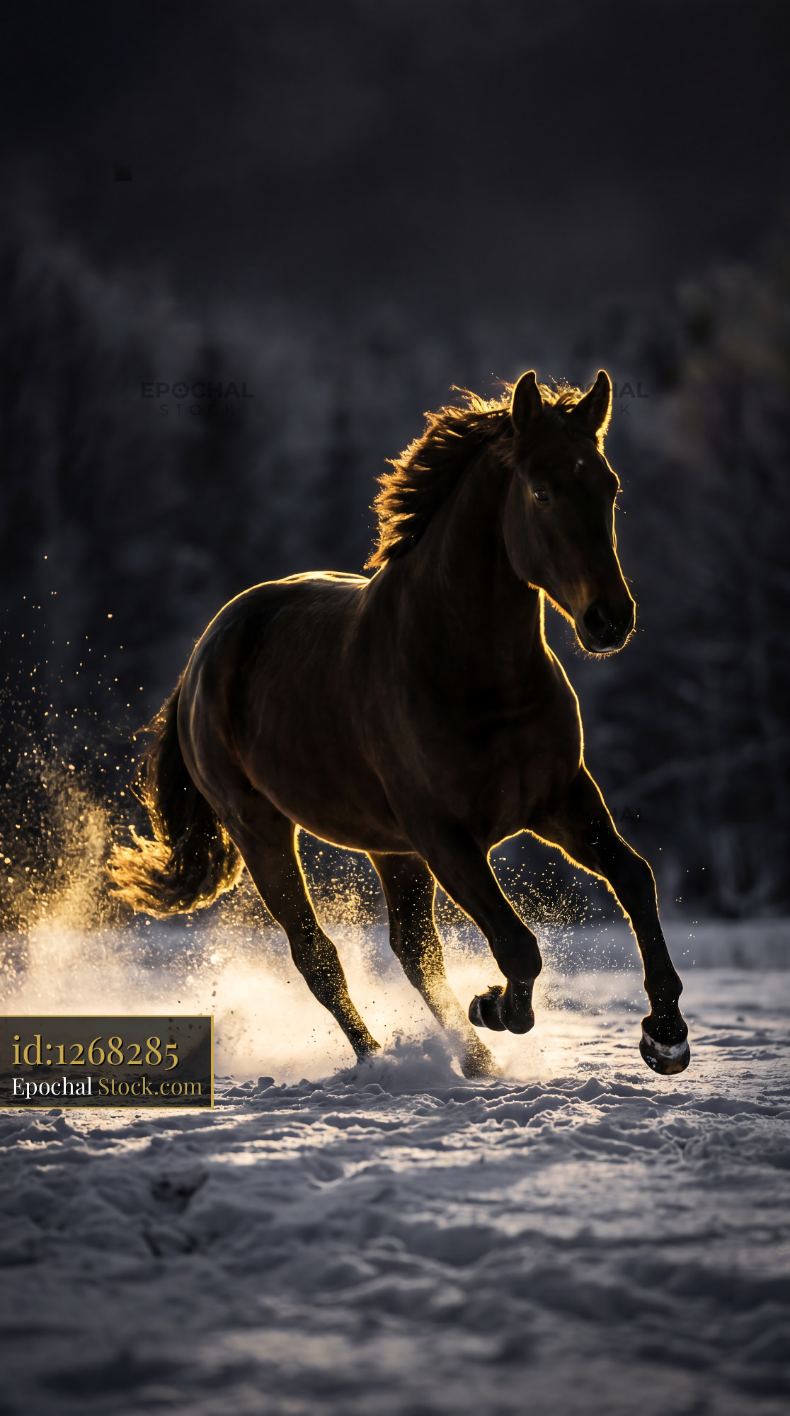 Dramatic backlit stallion galloping through frost. Ideal for sophisticated home decor, statement wallpaper, or unique quilting fabric and gift wrap projects.