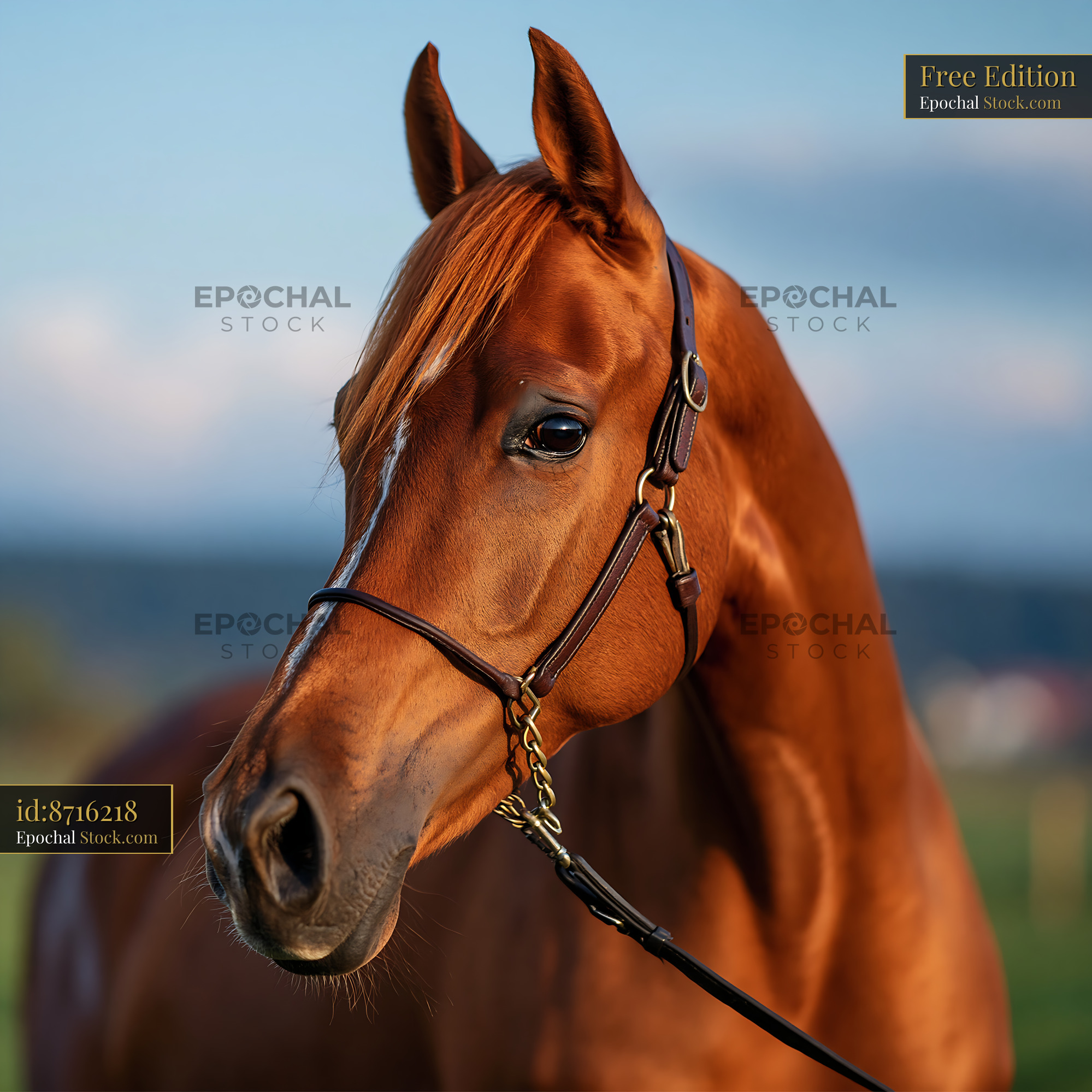 A close-up portrait of a noble chestnut horse looking into the distance during golden hour. The soft lighting emphasizes its elegant features and glossy coat in a peaceful rural setting.