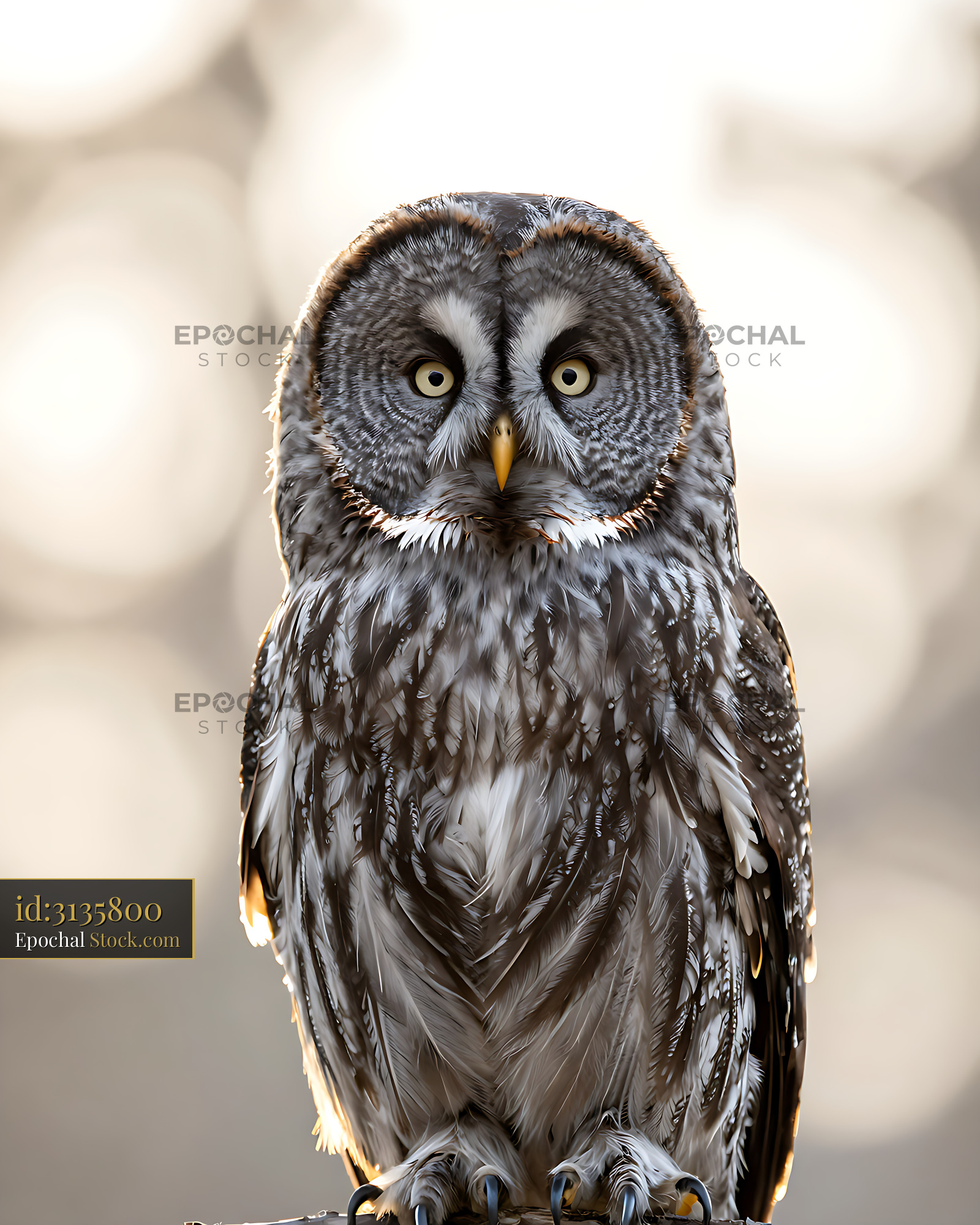 A majestic great grey owl perches calmly, its piercing yellow eyes and detailed plumage highlighted by soft natural light, evoking a sense of wisdom and wild beauty.