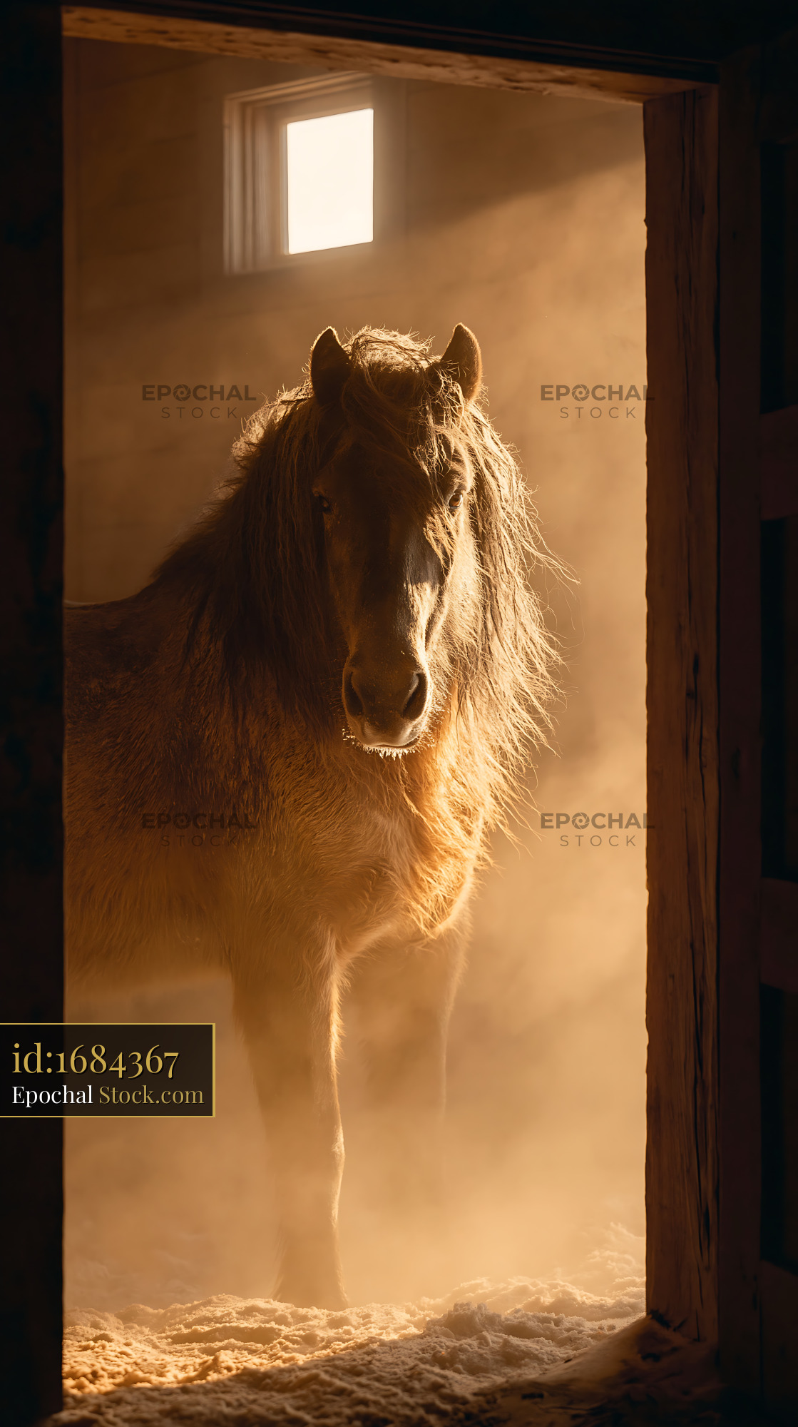 A powerful horse with a flowing mane stands in the light-filled doorway of a weathered barn. The scene evokes a sense of peace, rustic charm, and the quiet beauty of rural life.