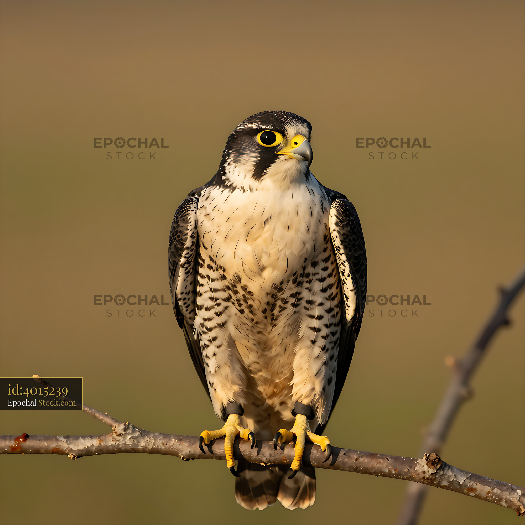 A majestic peregrine falcon perched on a weathered branch, its intense gaze and sharp talons highlighting the power and precision of nature's fastest predator during golden hour.