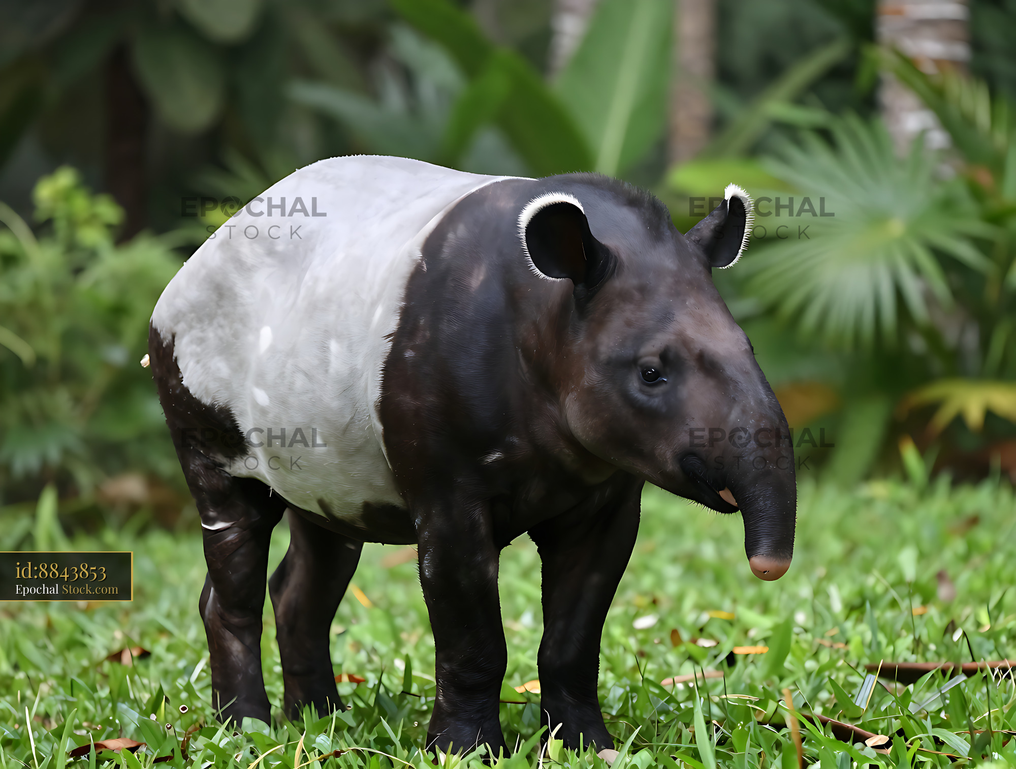 A side profile of a Malayan tapir with its distinctive black and white markings, standing peacefully in a vibrant tropical jungle environment.