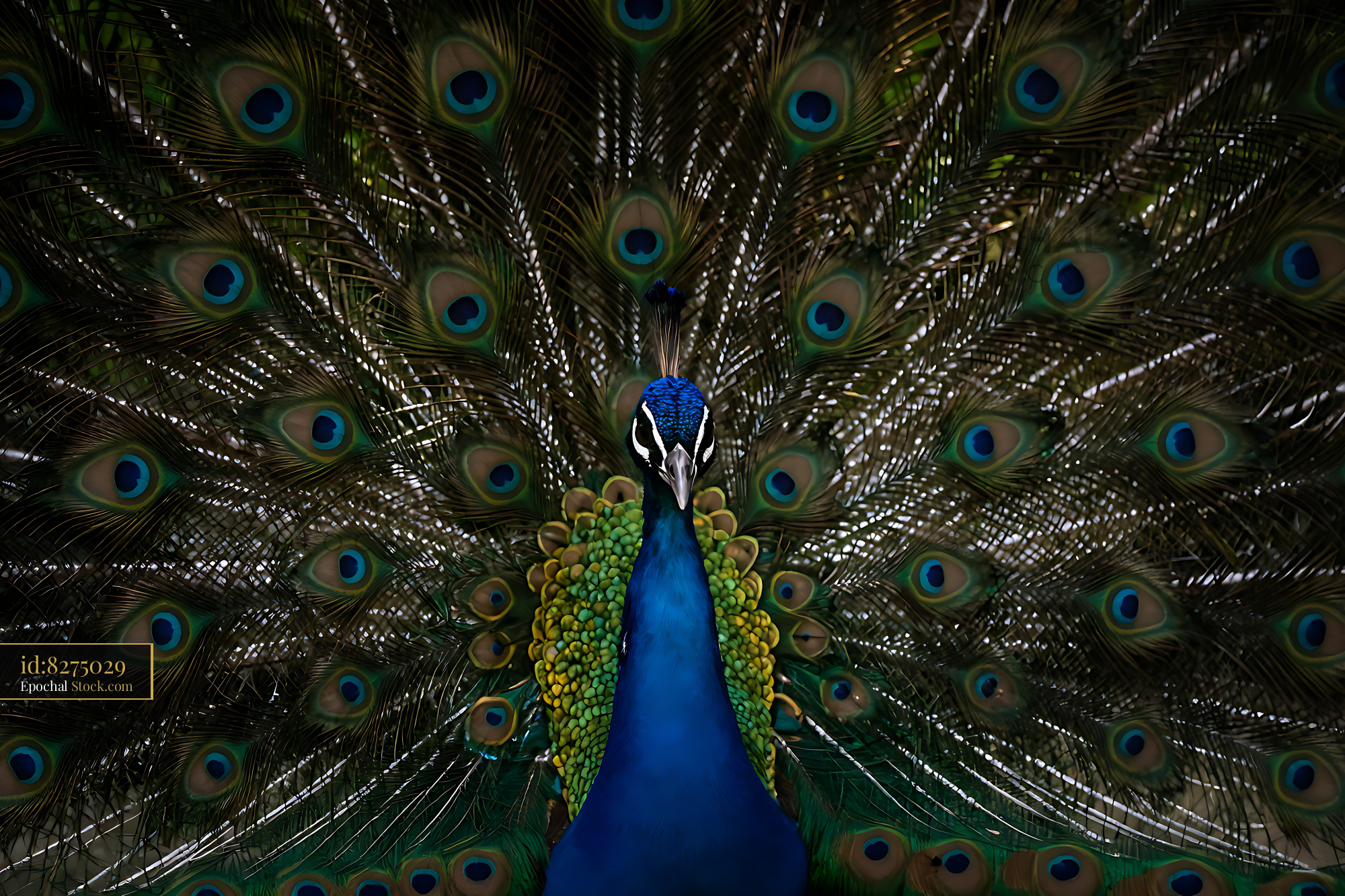 Male peacock displaying vibrant tail feathers in dramatic lighting
