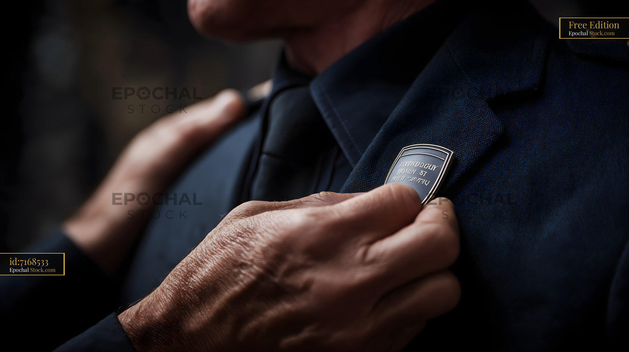 A man is carefully adjusting a badge on a police uniform. The setting has a formal atmosphere, suggesting an important event or ceremony taking place.