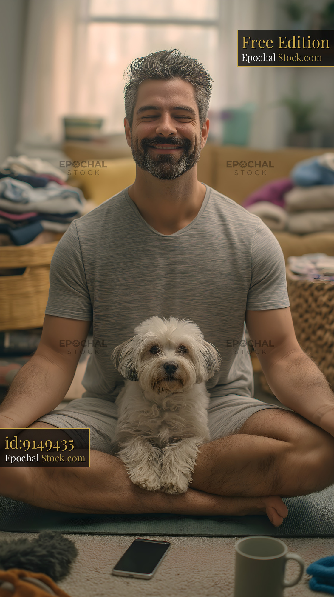 A man sits on a mat in his living room. He is cross-legged and smiling. A small dog rests in front of him. Clothes are piled on nearby furniture. The room has soft lighting and a relaxed feel.