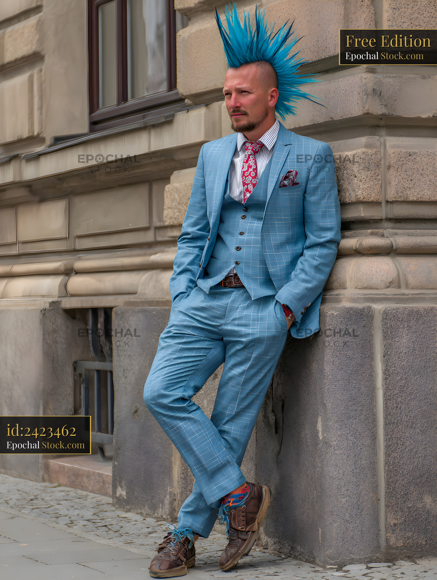 A man stands against a stone wall in the city. He wears a blue suit with a colorful tie. His hair is bright blue and spiked. He looks relaxed and confident while leaning against the wall.