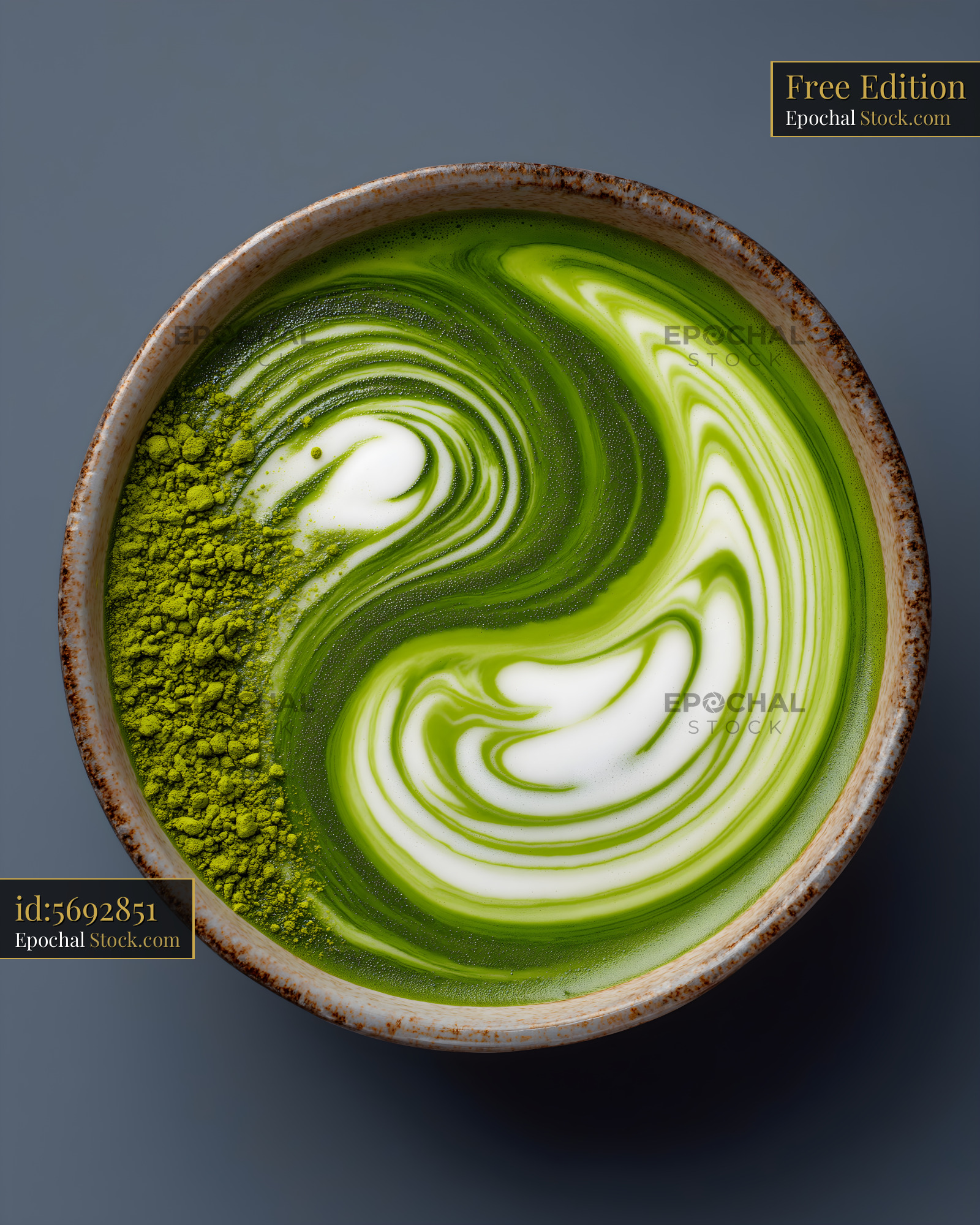 A bowl holds a green matcha drink. The drink has a swirl pattern made by mixing matcha powder and milk. This scene shows a simple setup on a gray surface.