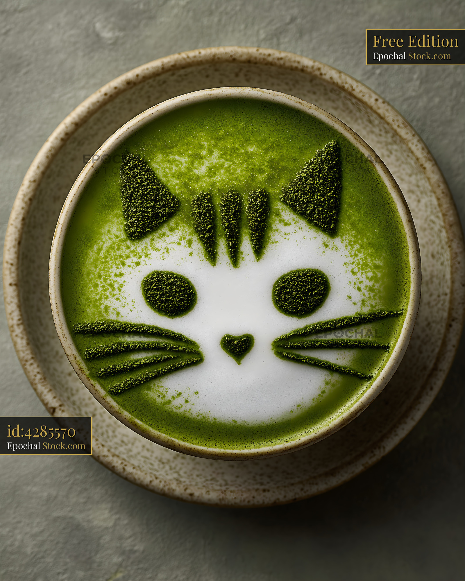 Matcha latte with cat design on green foam Free Premium Stock Image