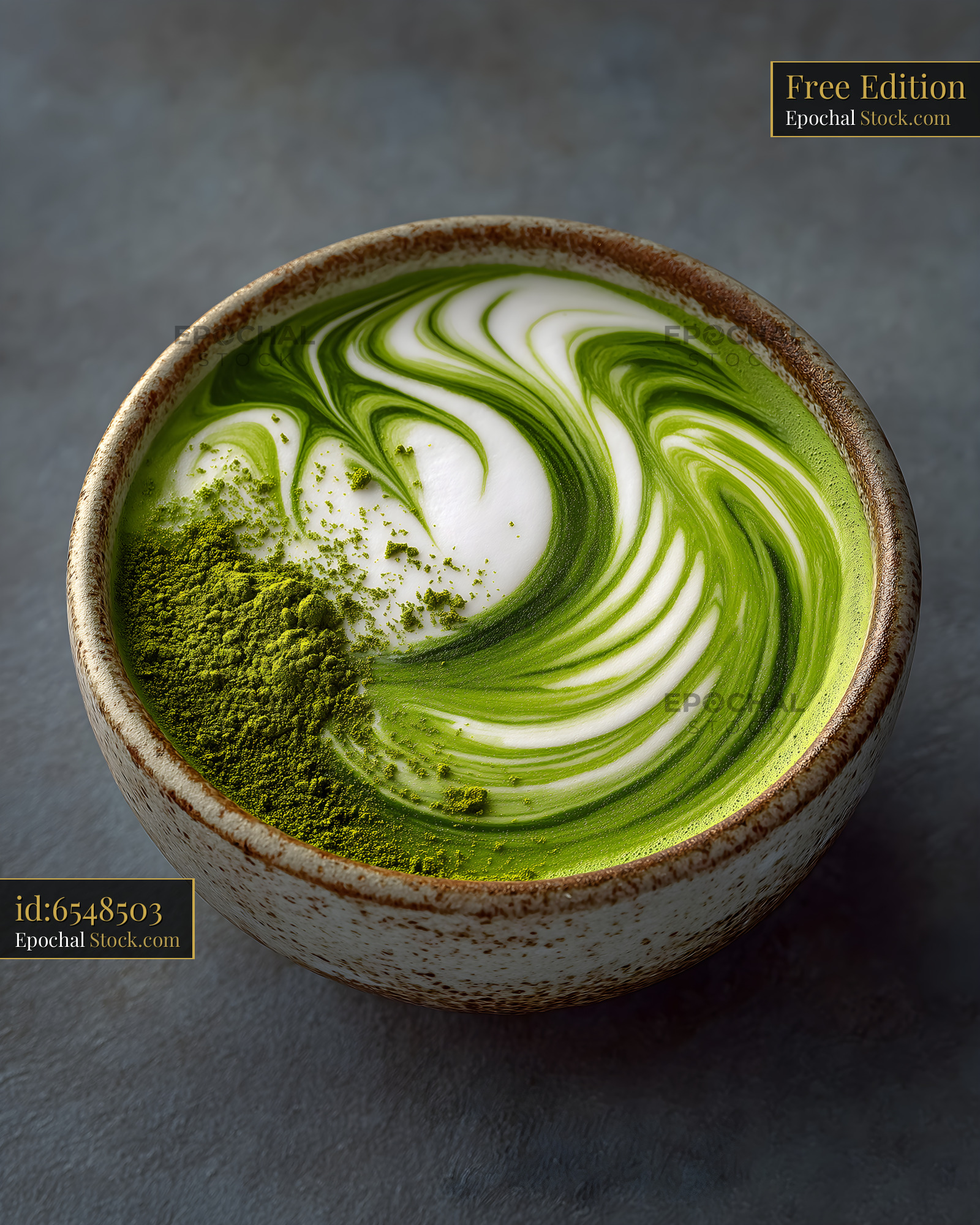 Matcha tea in a ceramic bowl with green swirls Free Premium Stock Photo