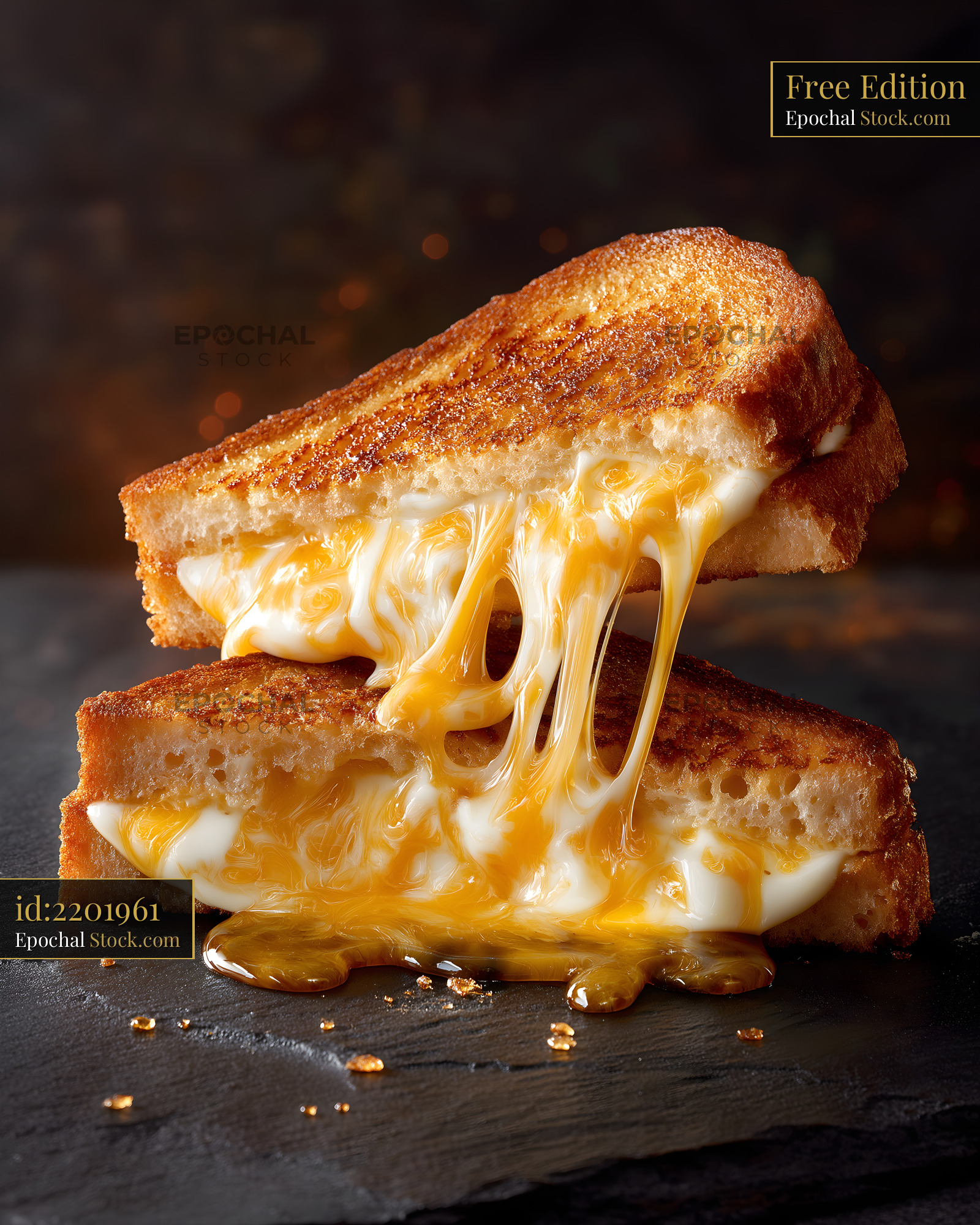 Melted cheese spilling from grilled sandwich on dark background Free Premium Stock Image