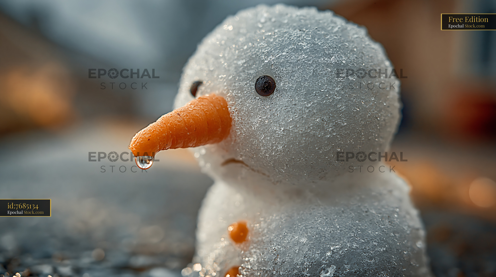 A tiny snowman begins to thaw as the warm spring sun arrives, featuring a dripping carrot nose and a melancholy expression that captures the transition of seasons and climate change.