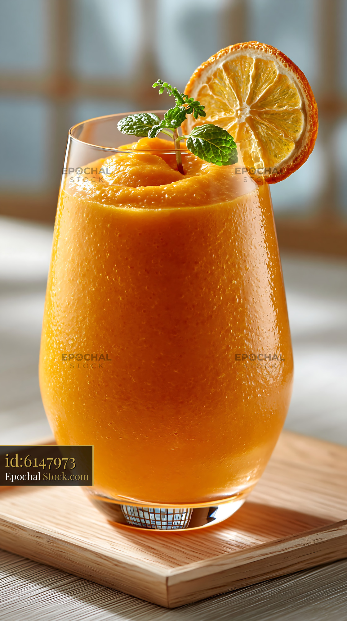 A vibrant mikan orange smoothie served in a glass on a wooden tray, garnished with a dried orange slice and mint, evoking a refreshing and healthy summer morning vibe.