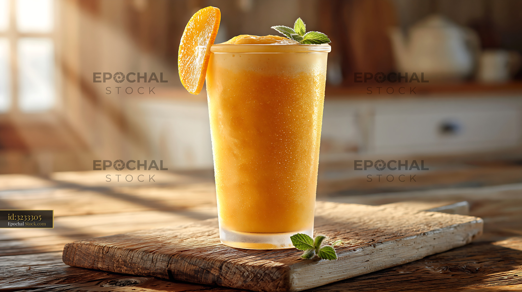 A refreshing mikan orange smoothie sits on a rustic wooden board, bathed in warm morning sunlight, evoking a sense of healthy living and a vibrant, energetic start to the day.