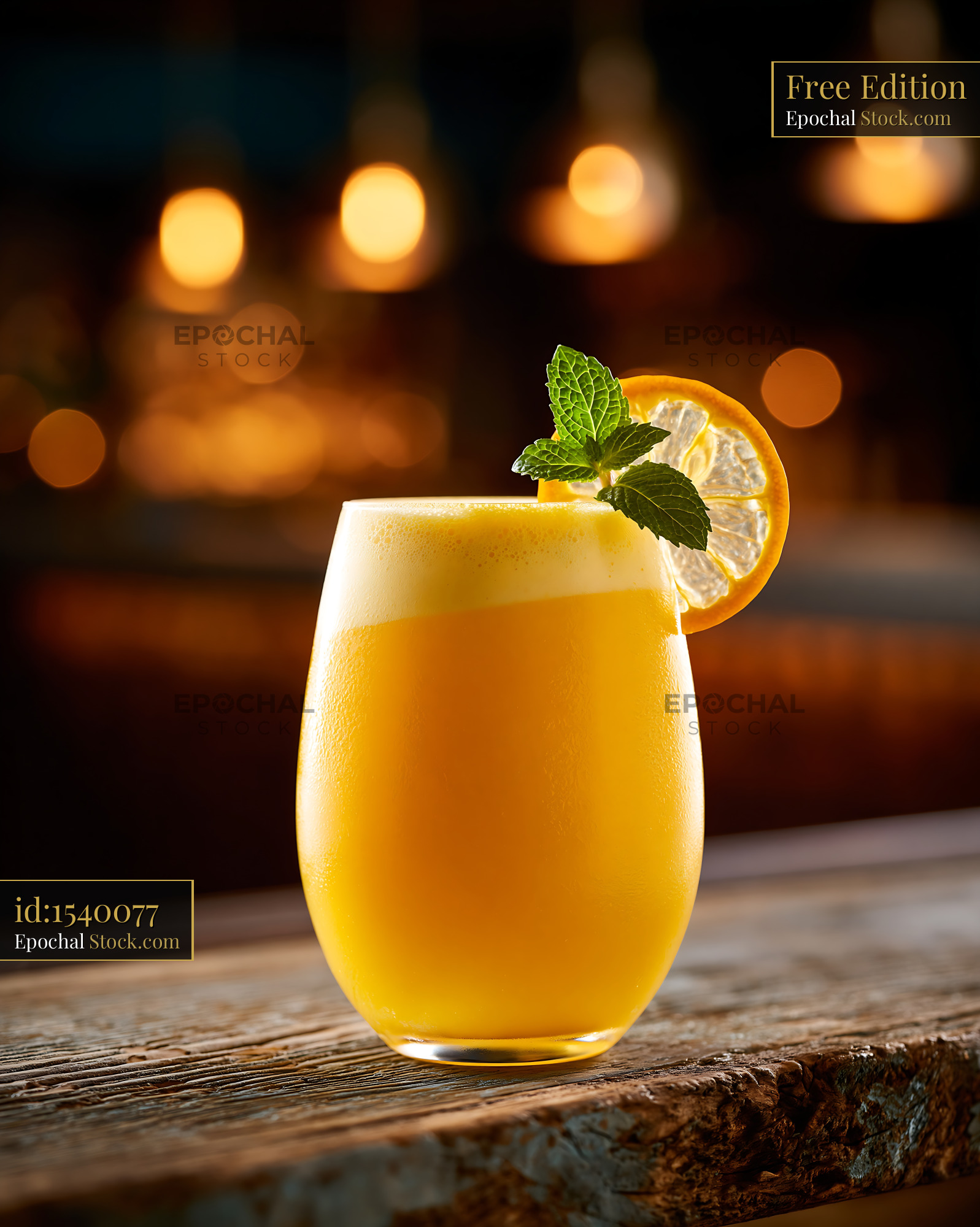 A vibrant mikan orange smoothie topped with foam, mint, and a citrus slice sits on a wooden counter, capturing a refreshing and sophisticated bar atmosphere with warm bokeh lights.
