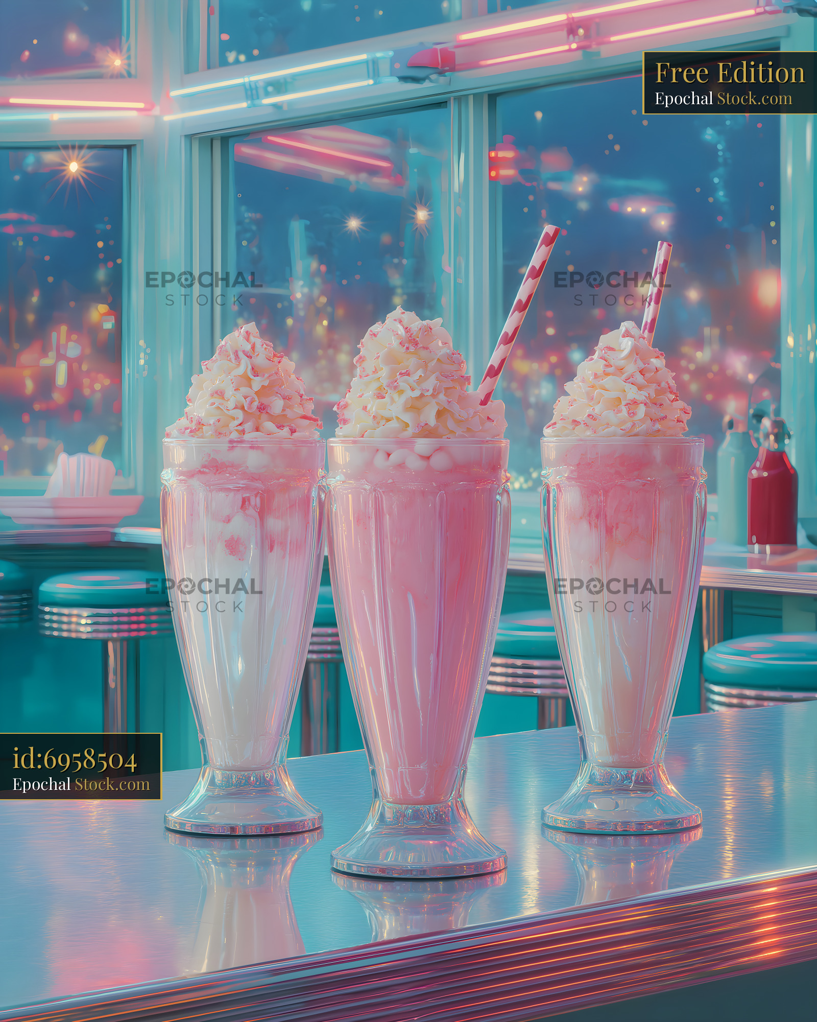 Three tall glasses of milkshakes sit on a counter in a diner. The drinks have whipped cream on top. Neon lights and a city view fill the background. It is night time.