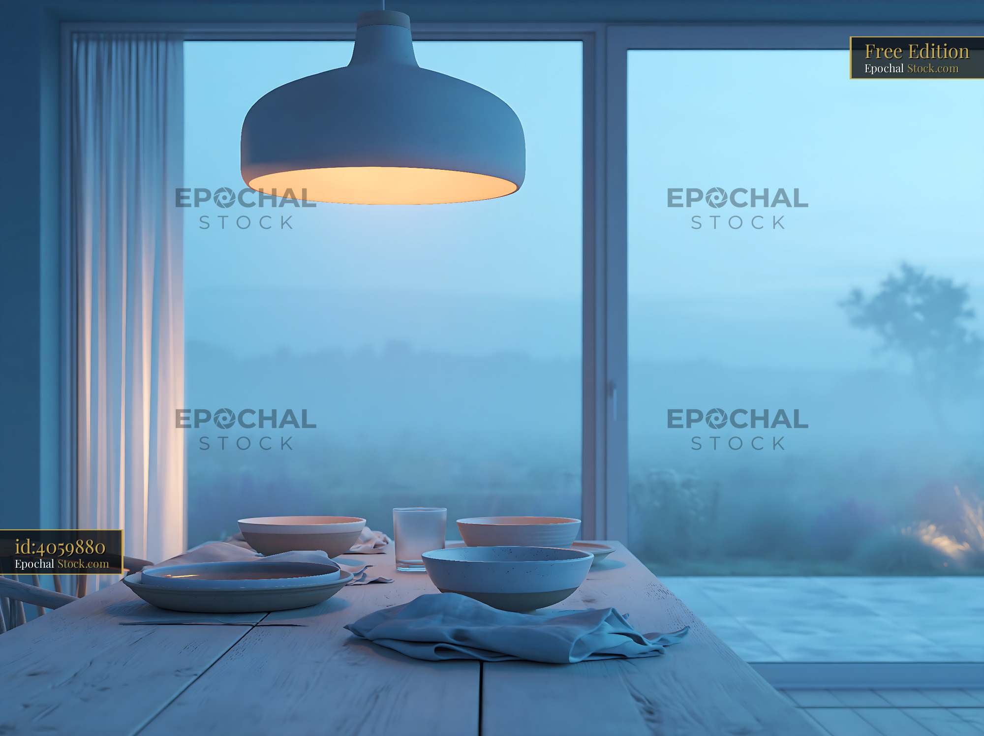 A serene dining area features a set wooden table under a warm lamp, overlooking a misty landscape at dawn, creating an atmosphere of quiet solitude and minimalist living.