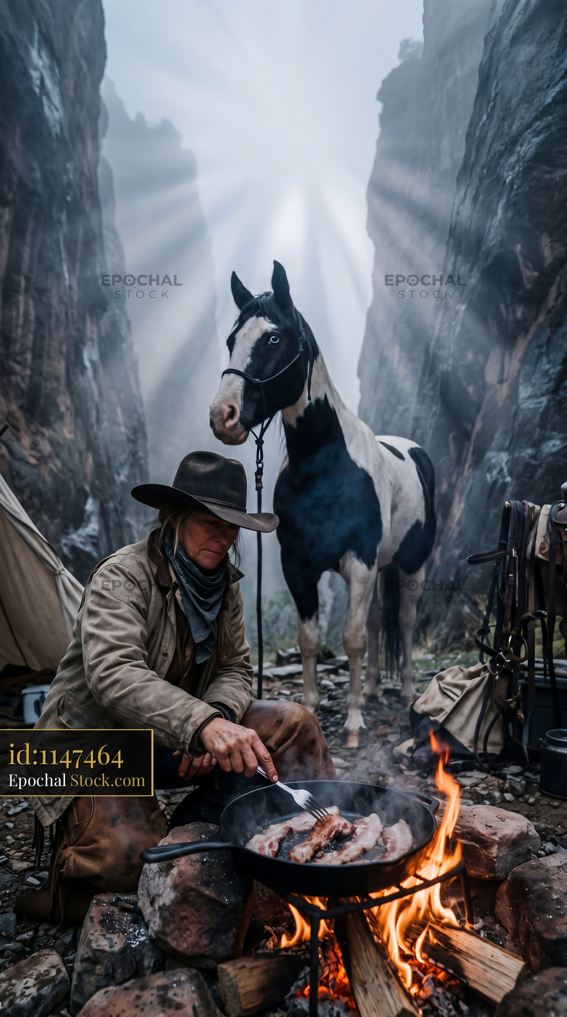 A moody western scene featuring a cowgirl cooking breakfast by a pinto horse in a misty canyon. Perfect for rustic home decor, quilting projects, or unique wallpaper.