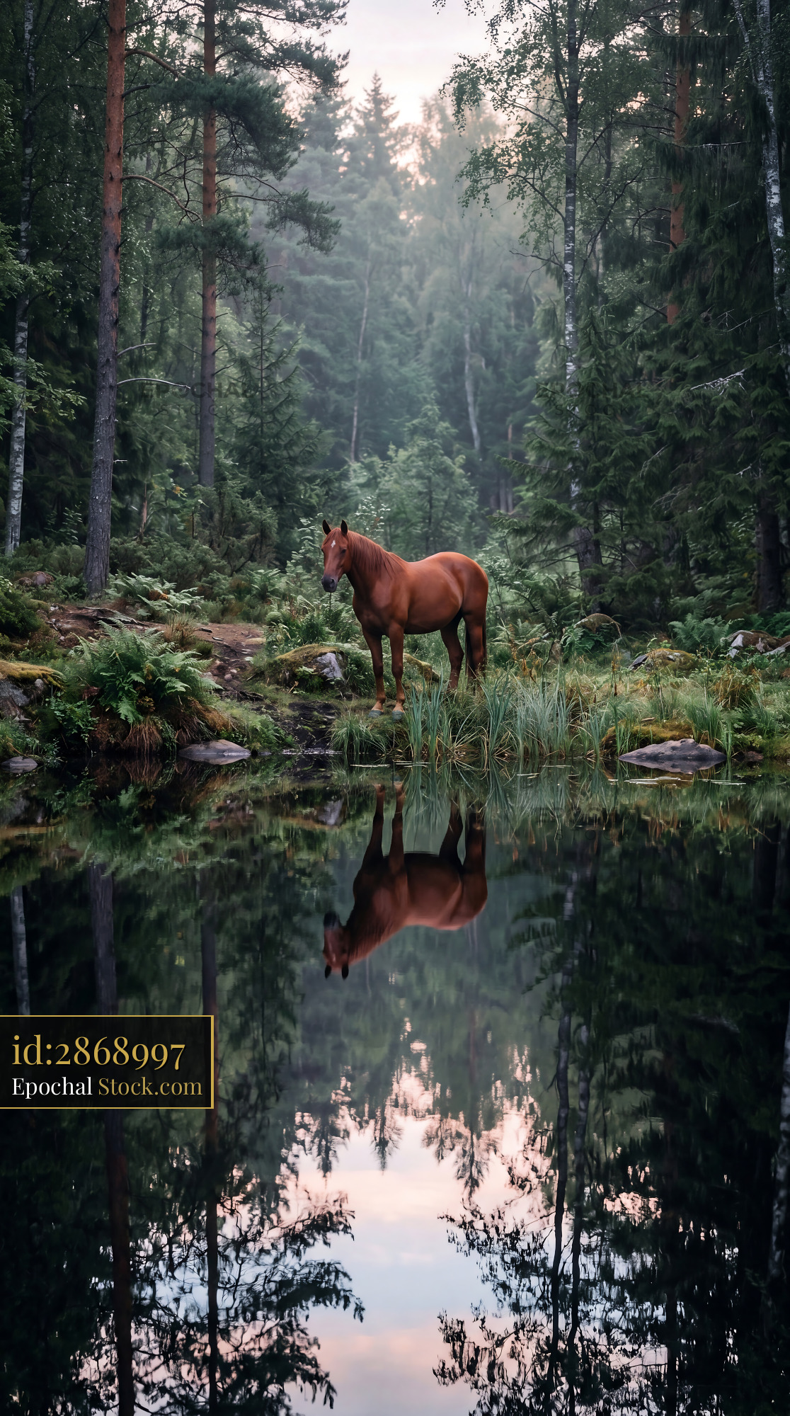 A serene landscape pattern featuring a chestnut horse reflected in a still pond at dawn. Perfect for nature-themed wallpaper, quilting fabric, and rustic home decor projects.