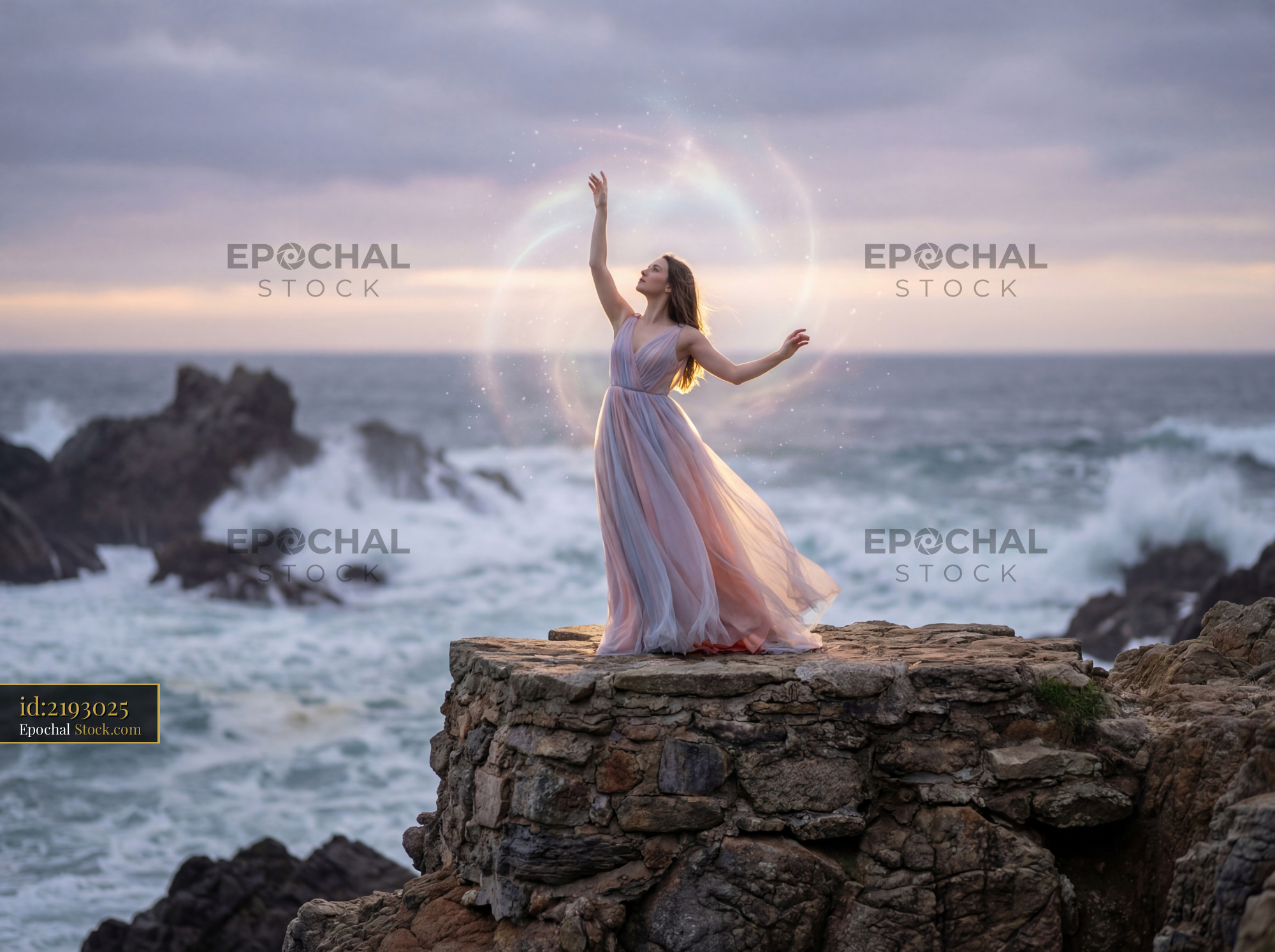 A woman performs a dance on a rock by the ocean as waves crash around her. The sky is gray and the sun sets in the background. She moves gracefully in a flowing dress.