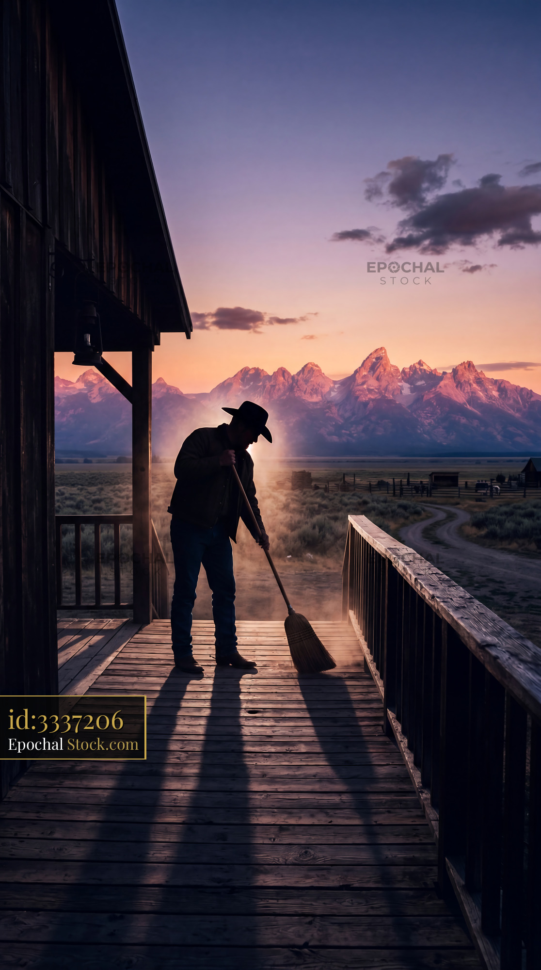 A cinematic western scene featuring a cowboy at twilight. Perfect for rustic home decor, ranch-style wallpaper, or quilting fabric for mountain lovers.