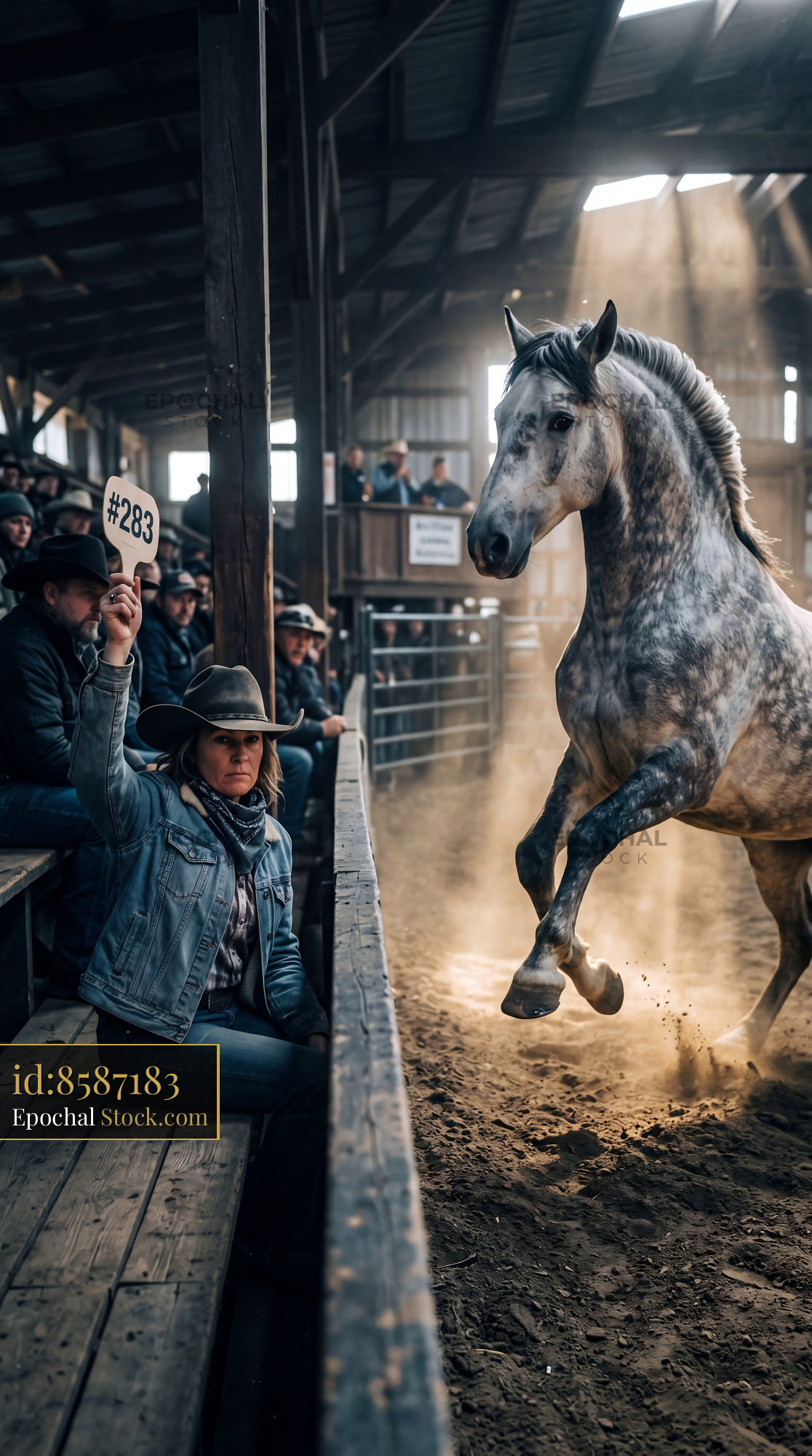 Dramatic scene of a rearing dapple grey horse and cowgirl bidding at an auction. Ideal for western-themed quilting, rustic home decor, or custom apparel.