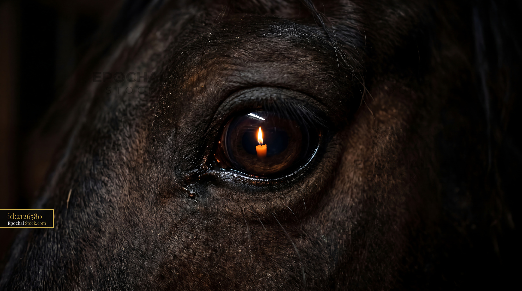 A dramatic extreme closeup of a horse's eye reflecting a single candle flame. Perfect for moody home decor, unique upholstery, or statement wallpaper in dark academia spaces.