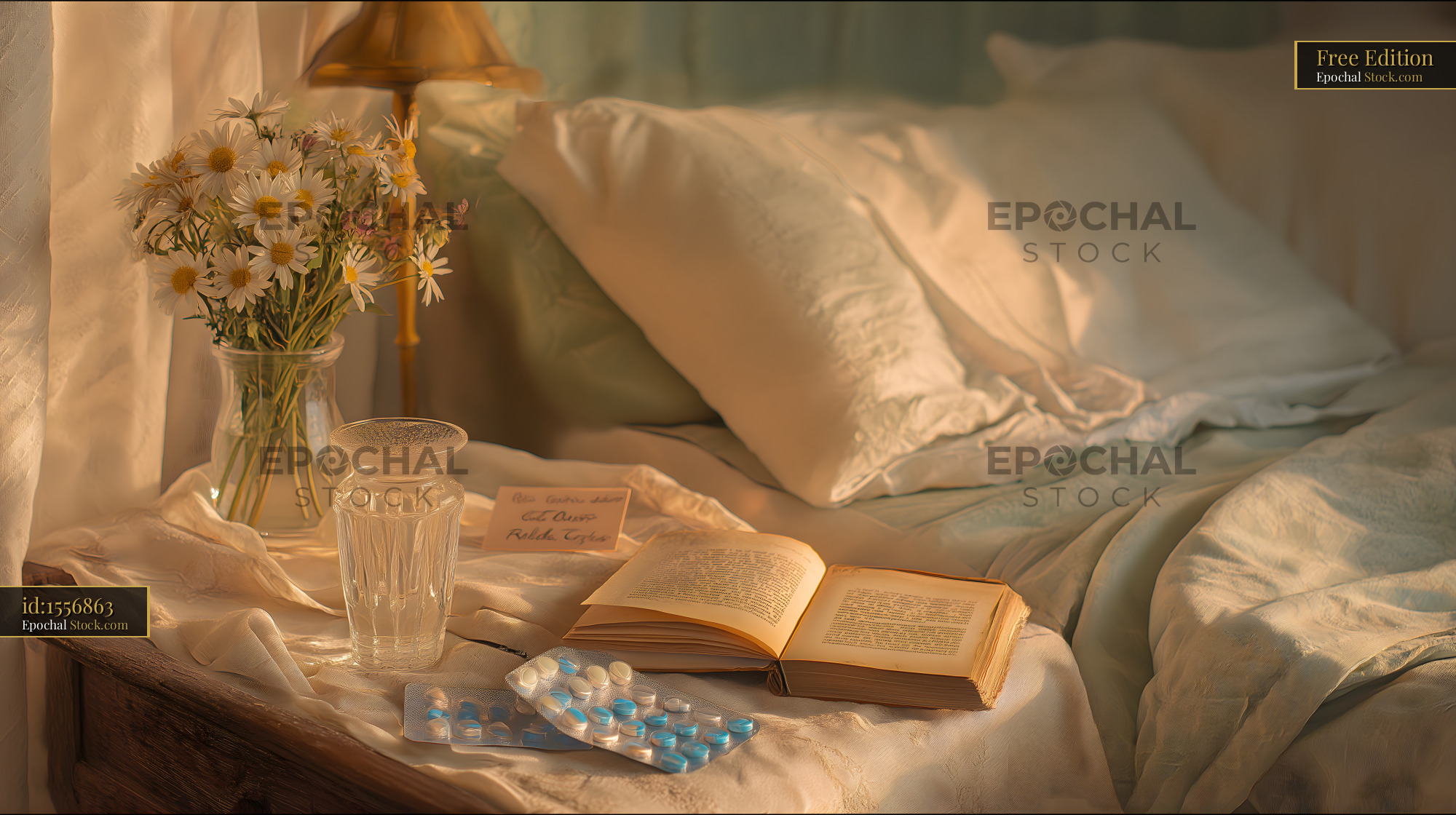 A bed with white sheets holds an open book and a glass of water. Nearby is a vase with flowers. A small packet of pills rests on the blanket. Morning light fills the room.