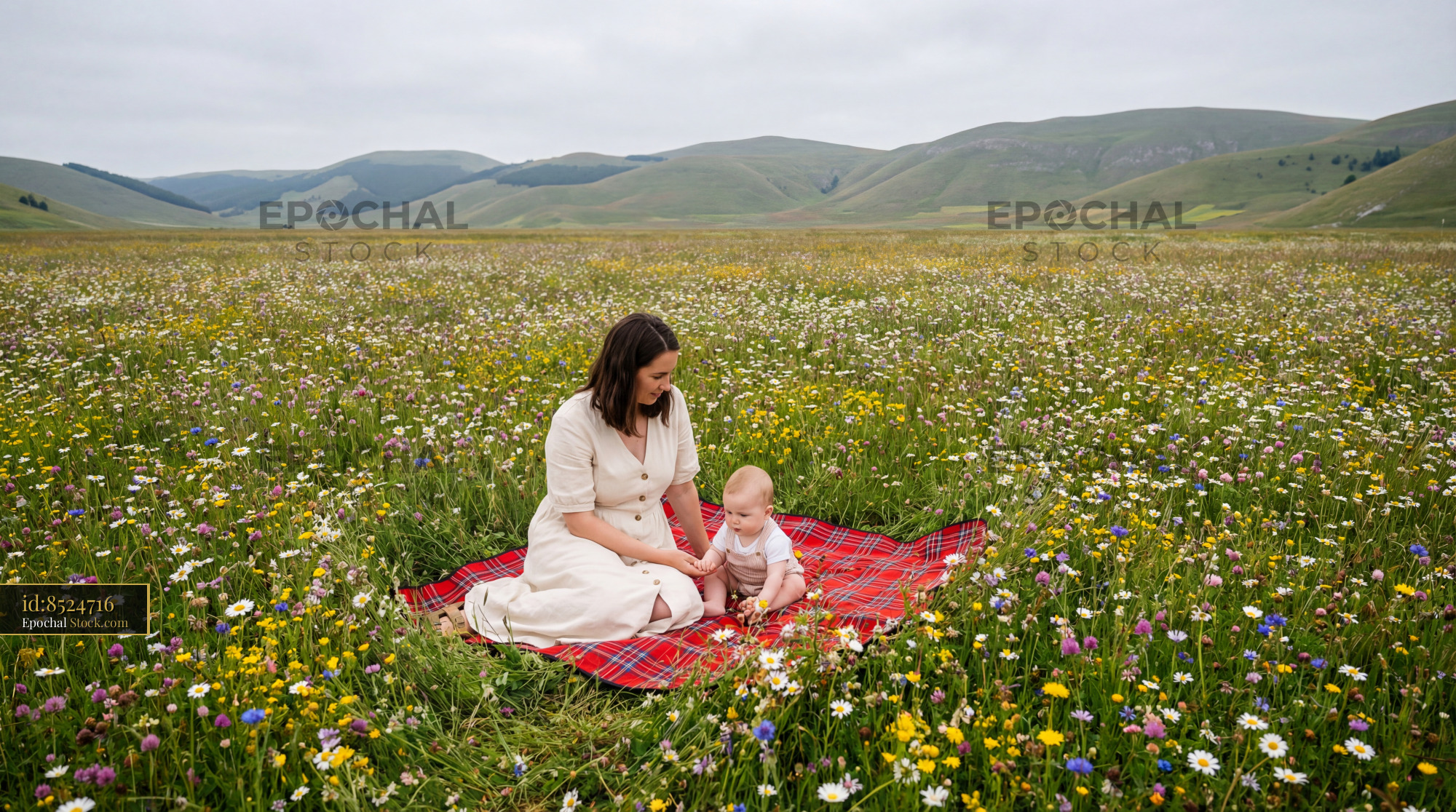A mother sits on a blanket with her baby in a large flower field. The background shows green hills and a cloudy sky. They share a moment in nature during daytime.