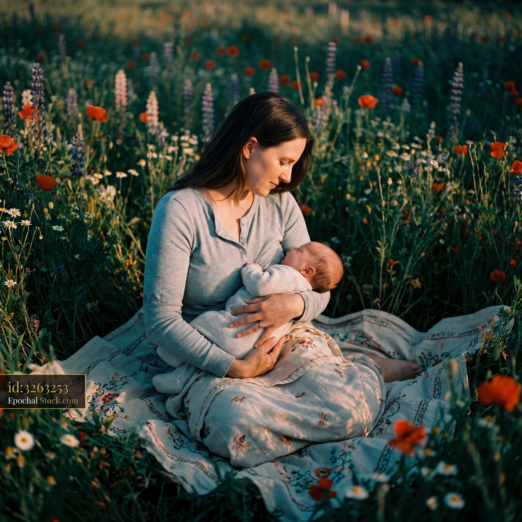 A woman holds her baby in her arms while sitting on a blanket in a field filled with various flowers. They enjoy a sunny day surrounded by nature and colorful blooms.