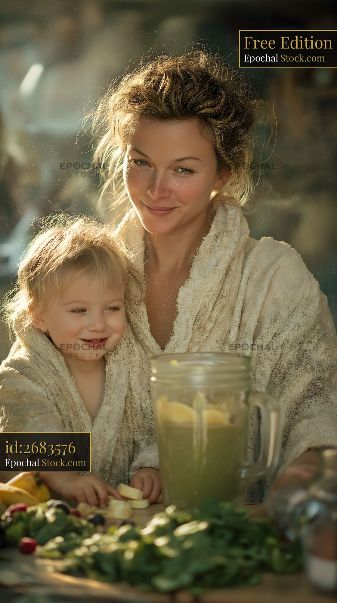 A mother and her young child stand together in a kitchen preparing a smoothie. They wear soft robes and smile. Fresh fruits and vegetables are on the table.