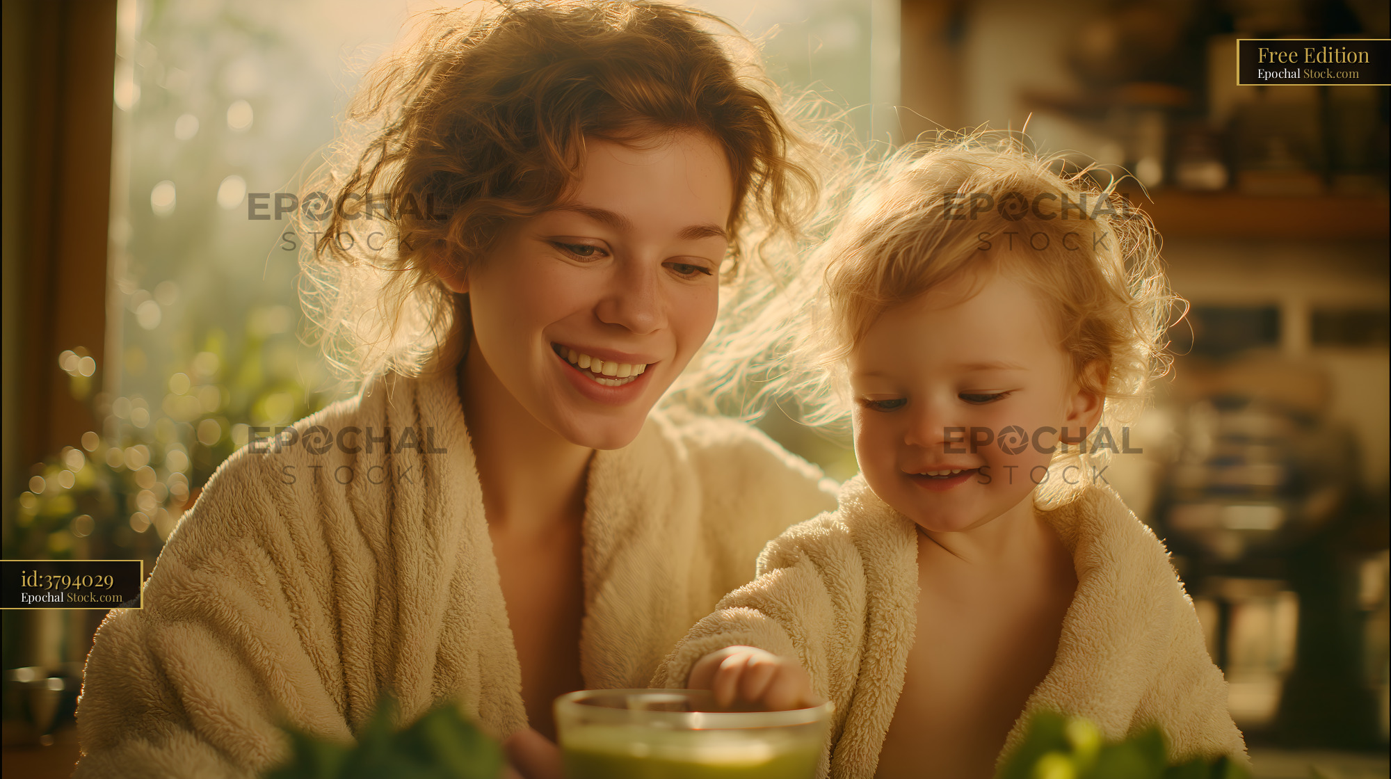 A woman and a young child are in a kitchen preparing food. They are smiling and enjoying their time together. They wear soft robes and are focused on a bowl of green ingredients.