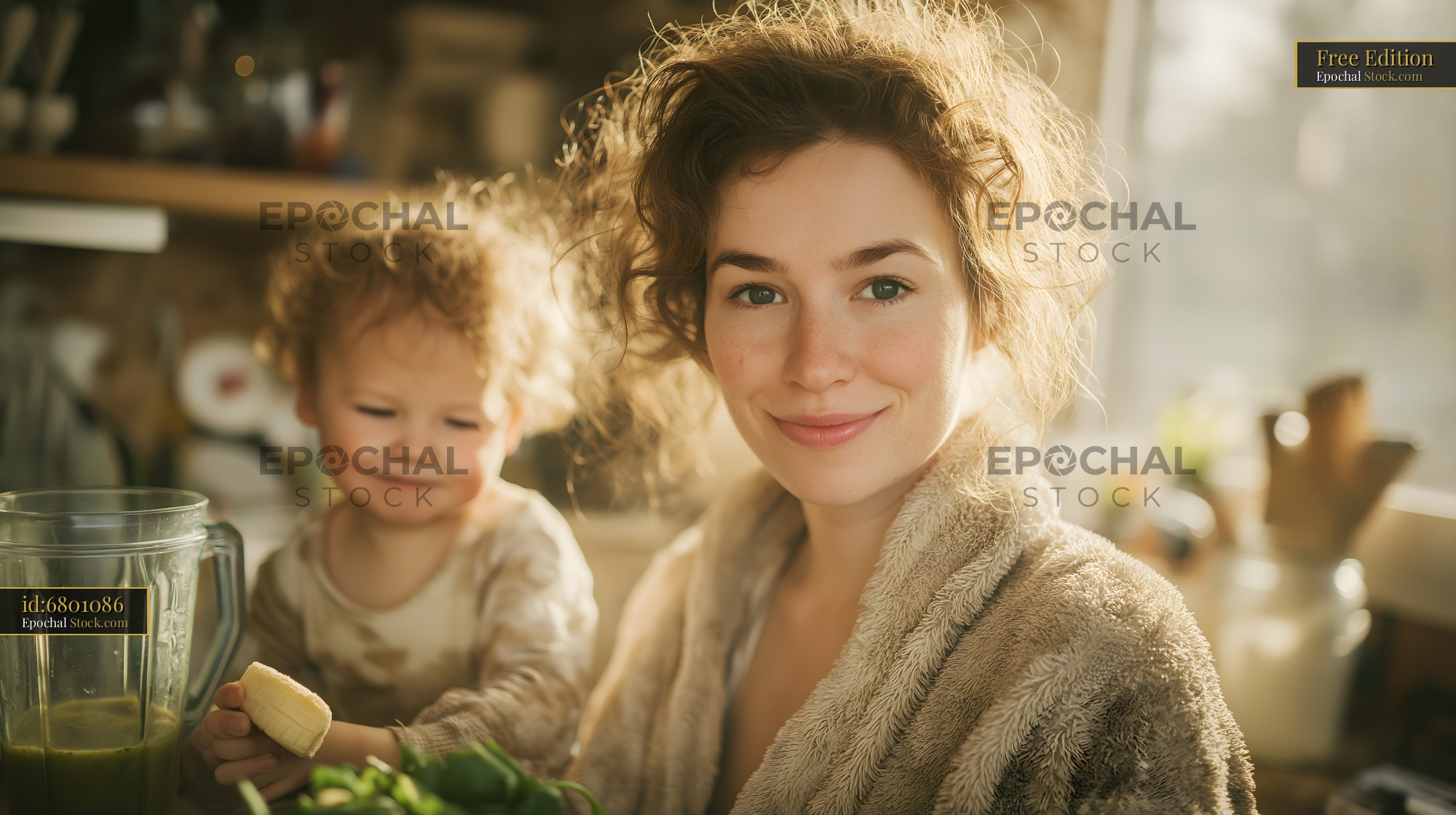Mother and child preparing food in a kitchen in morning light Free Premium Stock Photo