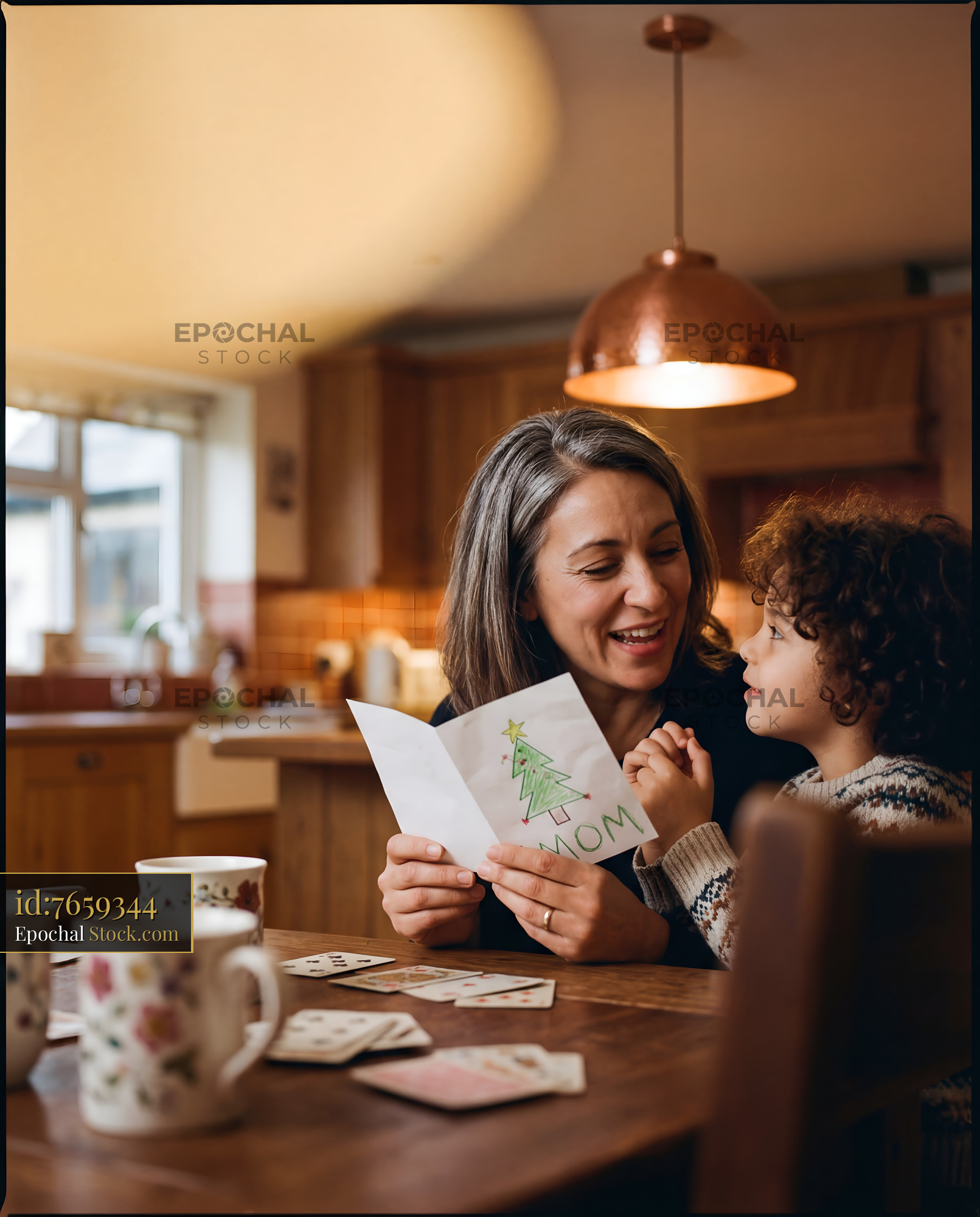 A mother and child sit at a table in the kitchen, enjoying time together. The child shows a card to the mother. They are in a well-lit room with warm colors and playful decor.