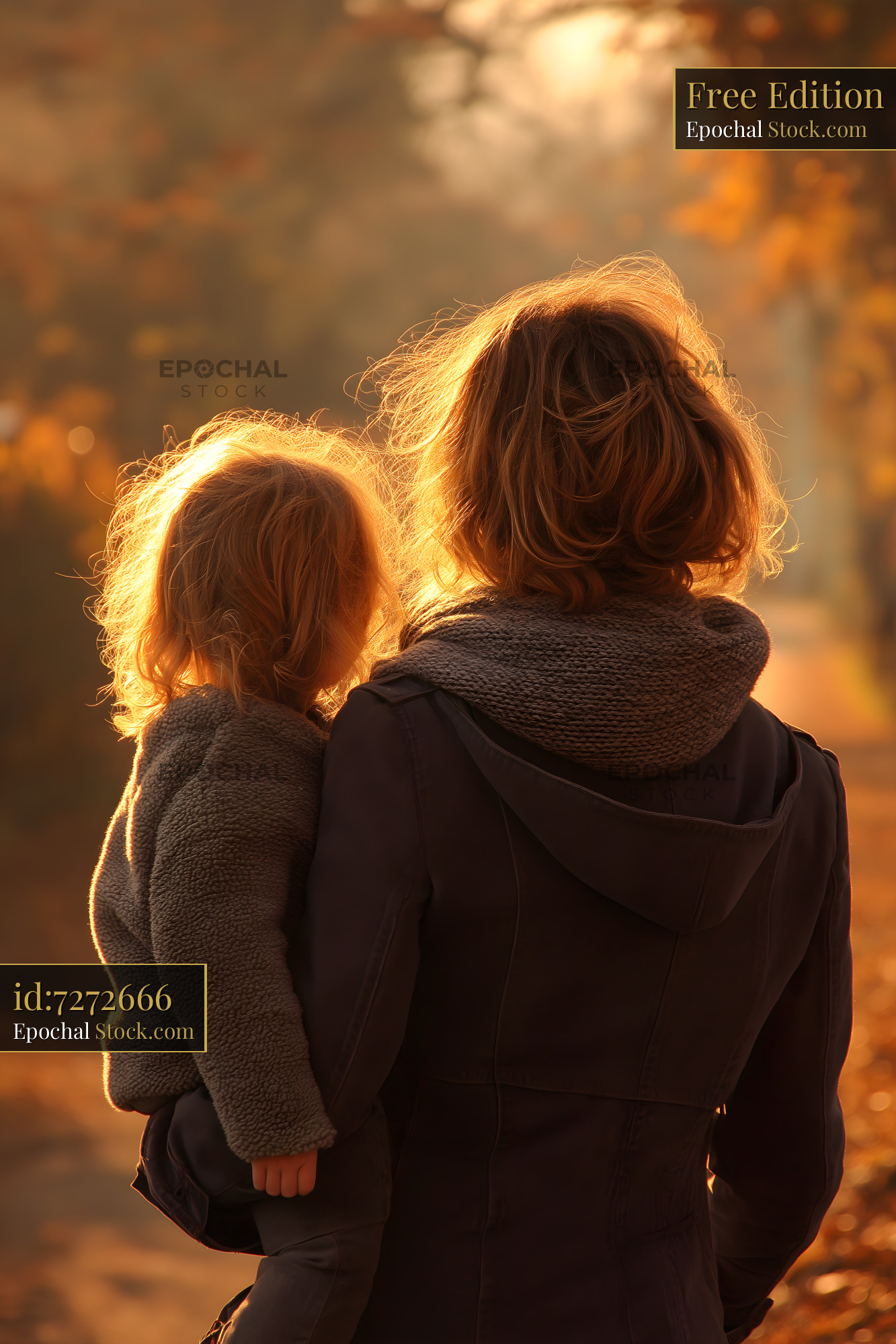 A mother carries her child while walking on a path through fall trees. The sun sets, creating warm light around them. Their backs are shown as they enjoy time together outdoors.