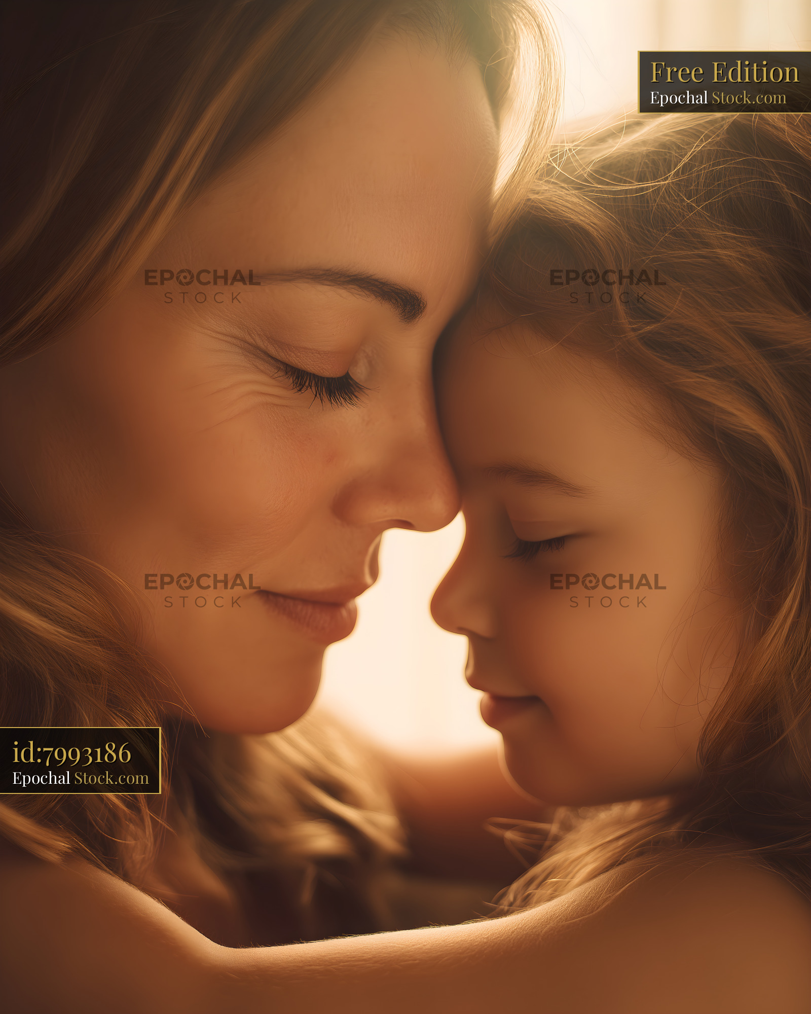A mother and her young daughter lean in close, touching foreheads. They share a warm moment of connection. Soft sunlight fills the room creating a gentle atmosphere.