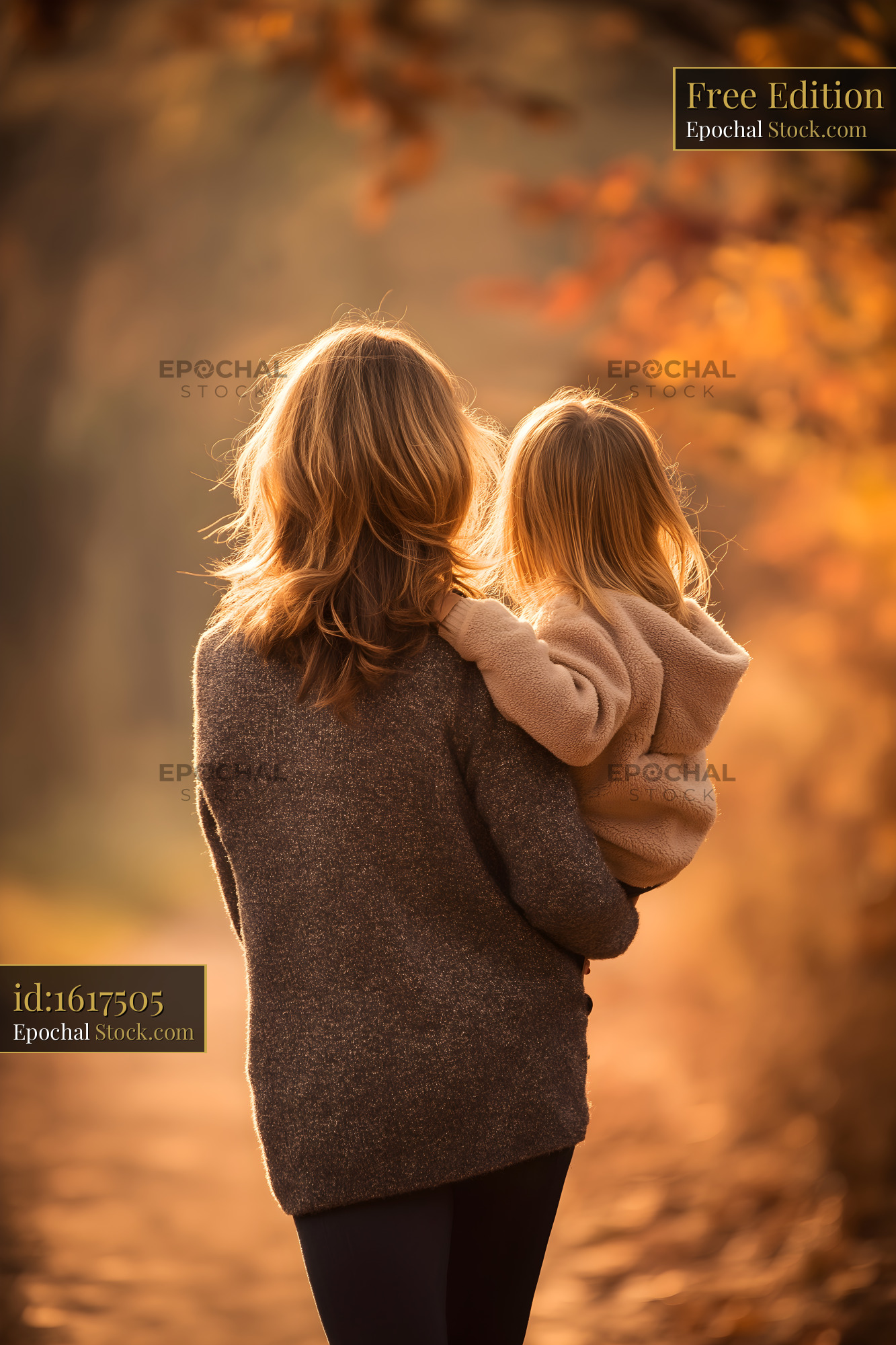 A mother walks through an autumn forest carrying her young child. They enjoy the warm light of sunset as the leaves change color around them.