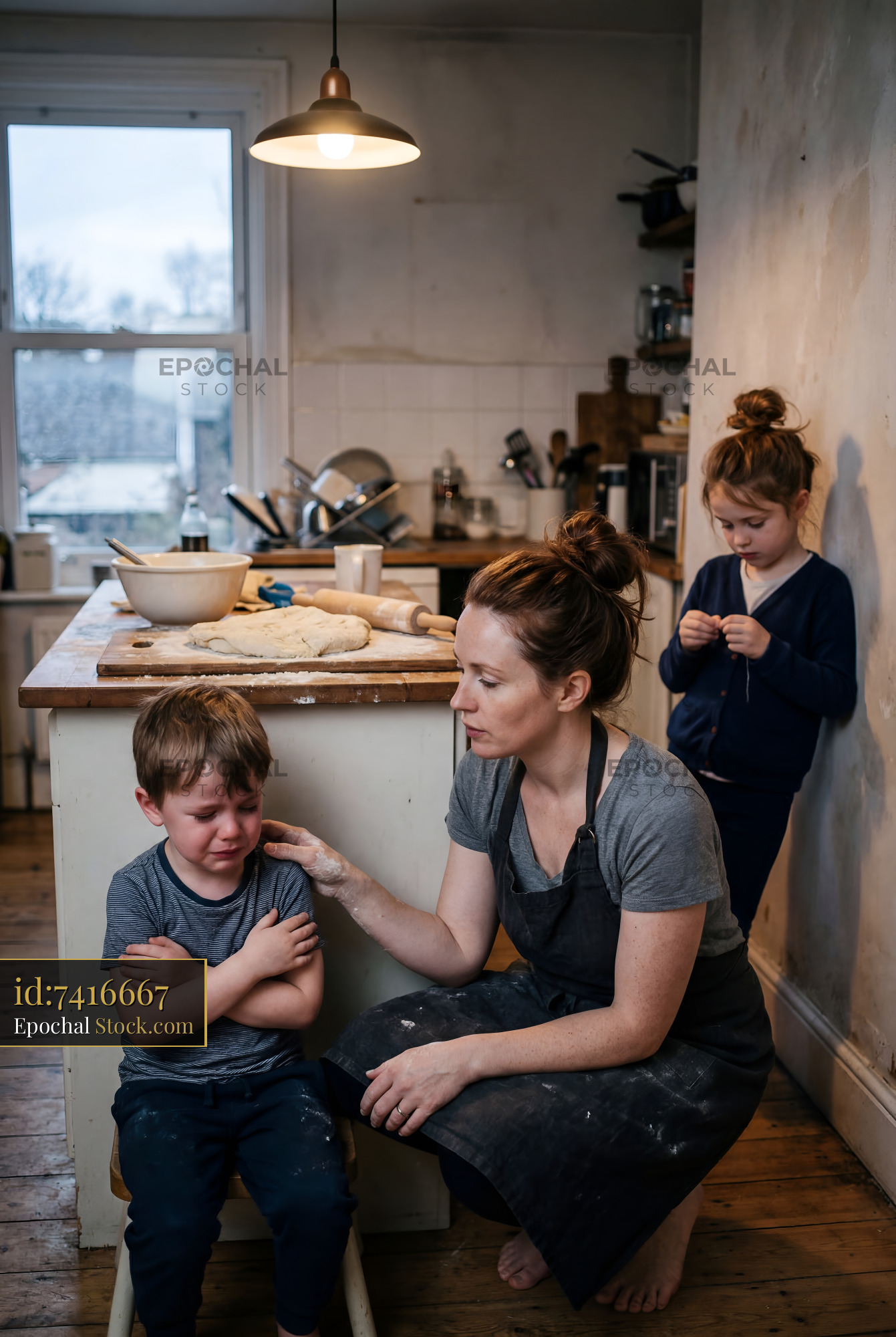 Mother comforts son in kitchen during baking activity Premium Stock Image