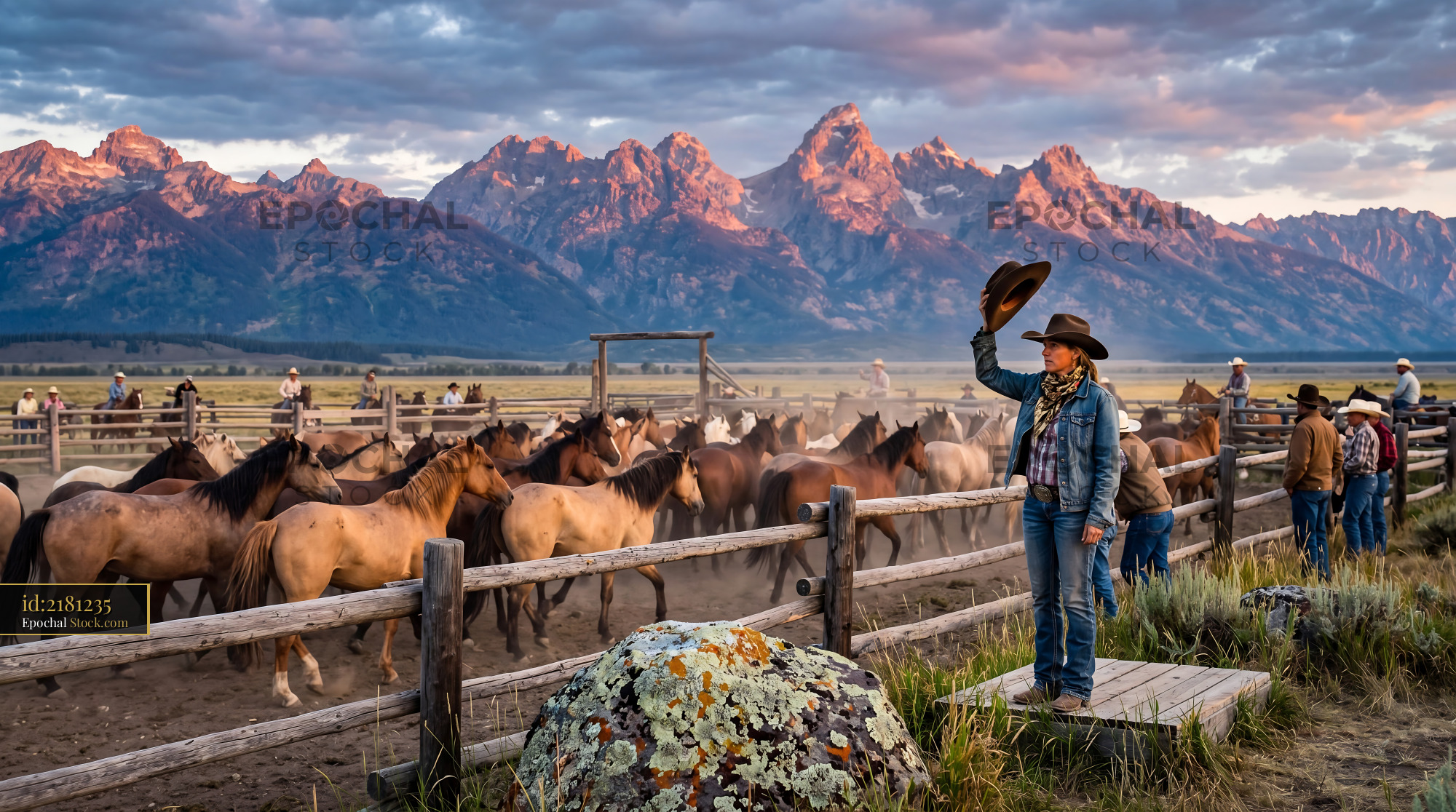 Cinematic western landscape with a cowgirl at a mountain horse auction. Ideal for rustic home decor, ranch quilting fabric, or unique wallpaper for equestrian spaces.