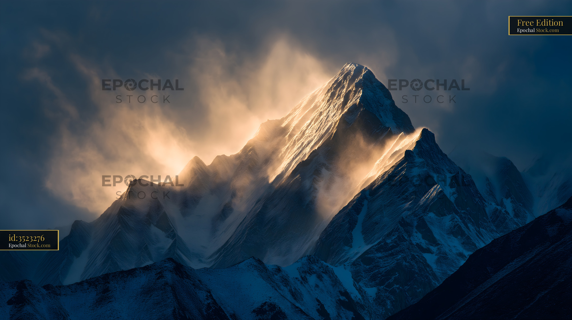 Tall mountains rise against a dark sky. Light shines on the peaks as clouds swirl around. The scene shows nature in a powerful moment during the evening.